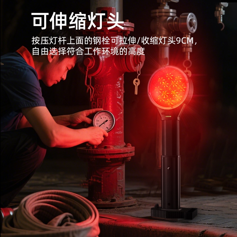 2、灯头可伸缩,按压灯杆上面的钢栓可拉伸/收缩灯头9CM;