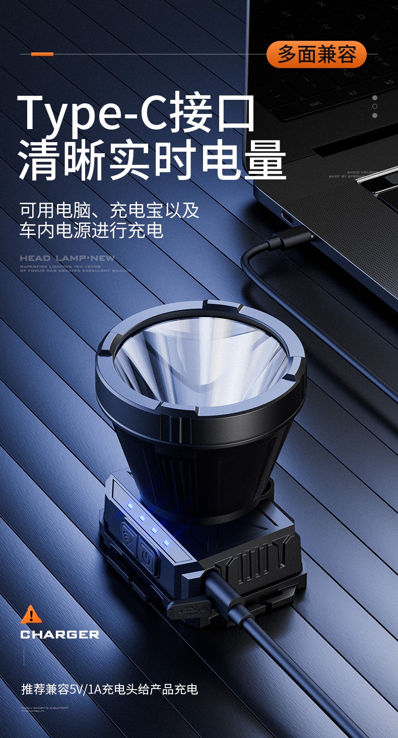 5、多样化充电,使用方便;设有type-c充电接口,可使用充电器、充电宝、电脑等设备为手电 充电。