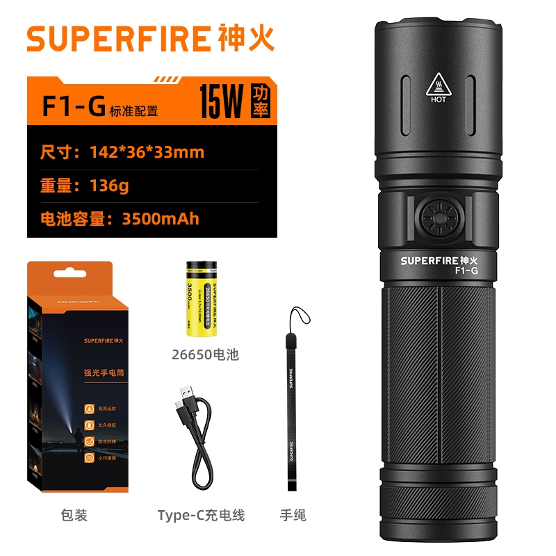 1、千米远射,射程更远,光斑更聚焦。 2、进口灯珠,亮度高,照明效果更好。 3、前后双按键,光源一键点亮,高亮瞬间开启。