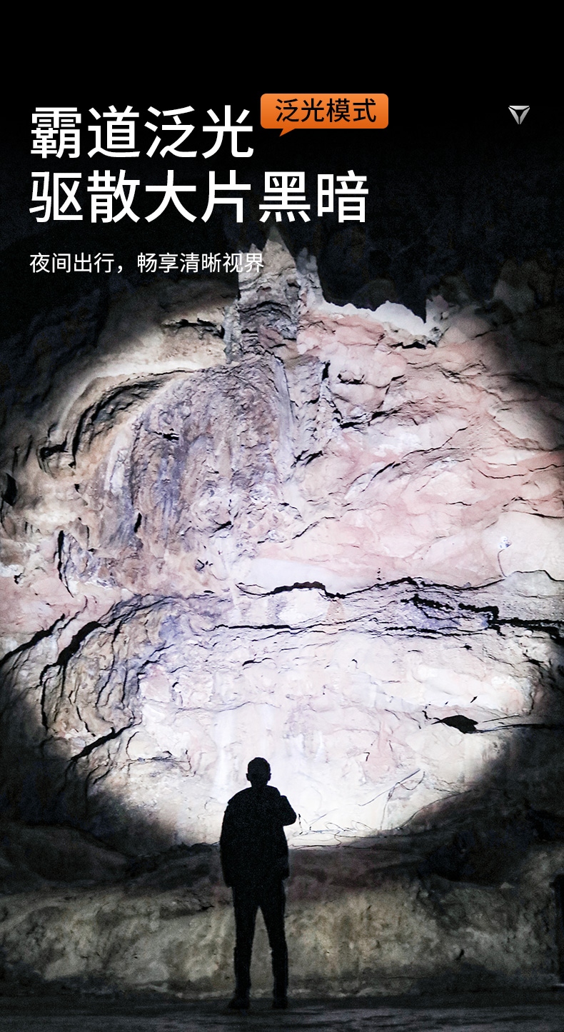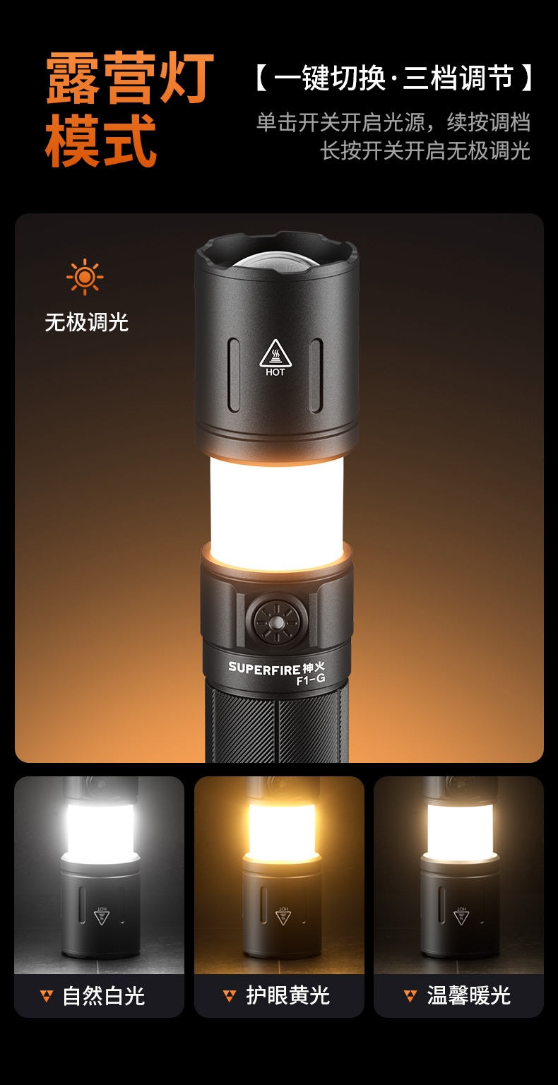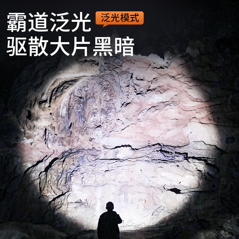 聚光主灯 亮度随心 轻按后端开关按钮,主灯强光点亮,续按依次切换主灯工作光-爆闪光。主灯开启状态下长按5秒,可实现光源色温转换。主灯关闭状态下长按5秒,可开启灯具最亮照明模式。 爆亮强光 亮如白昼 1500LM大功率高亮光源,点亮顷刻如白昼