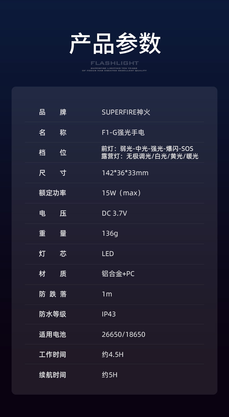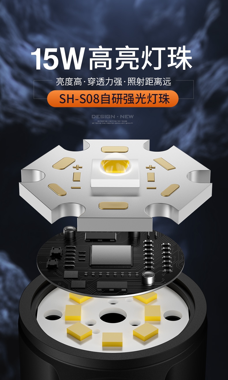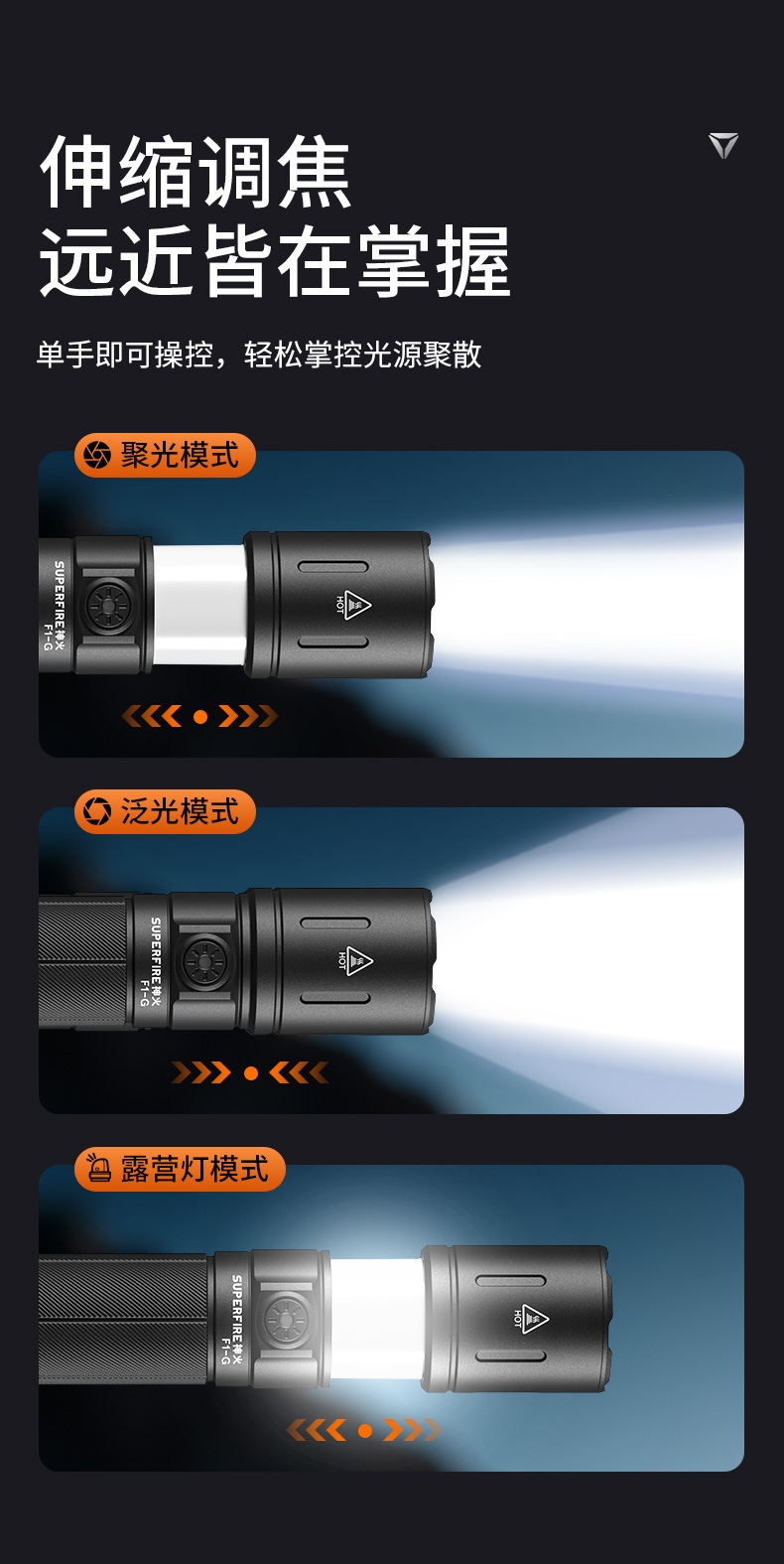 聚光主灯 亮度随心 轻按后端开关按钮,主灯强光点亮,续按依次切换主灯工作光-爆闪光。主灯开启状态下长按5秒,可实现光源色温转换。主灯关闭状态下长按5秒,可开启灯具最亮照明模式。 爆亮强光 亮如白昼 1500LM大功率高亮光源,点亮顷刻如白昼