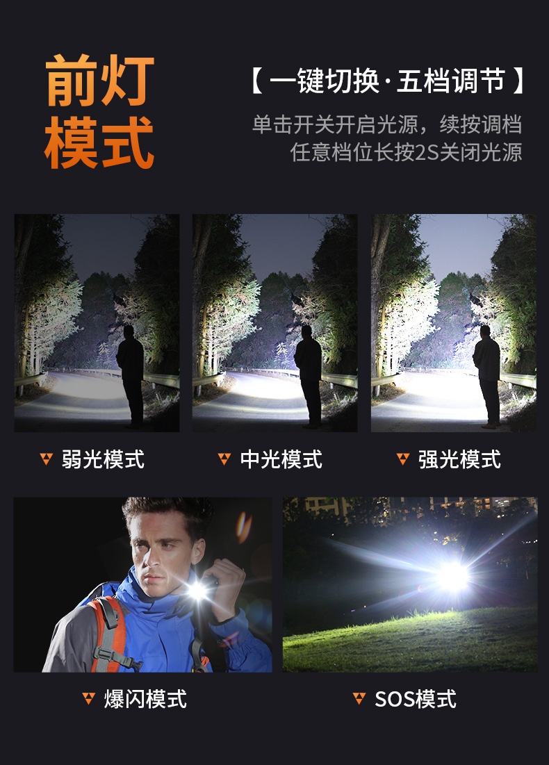 强光亮度,运动头灯,前后均衡设计,轻便不压头,可调节式头灯带,佩戴方便舒适,伸缩调焦,光照范围大,照射距离远,头灯角度调节,超90度角度随意调节,适宜各种环境使用