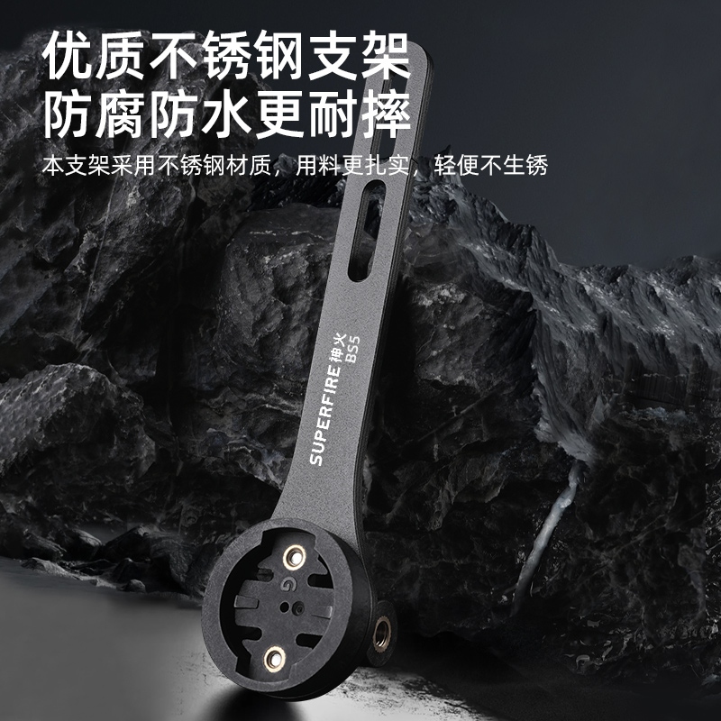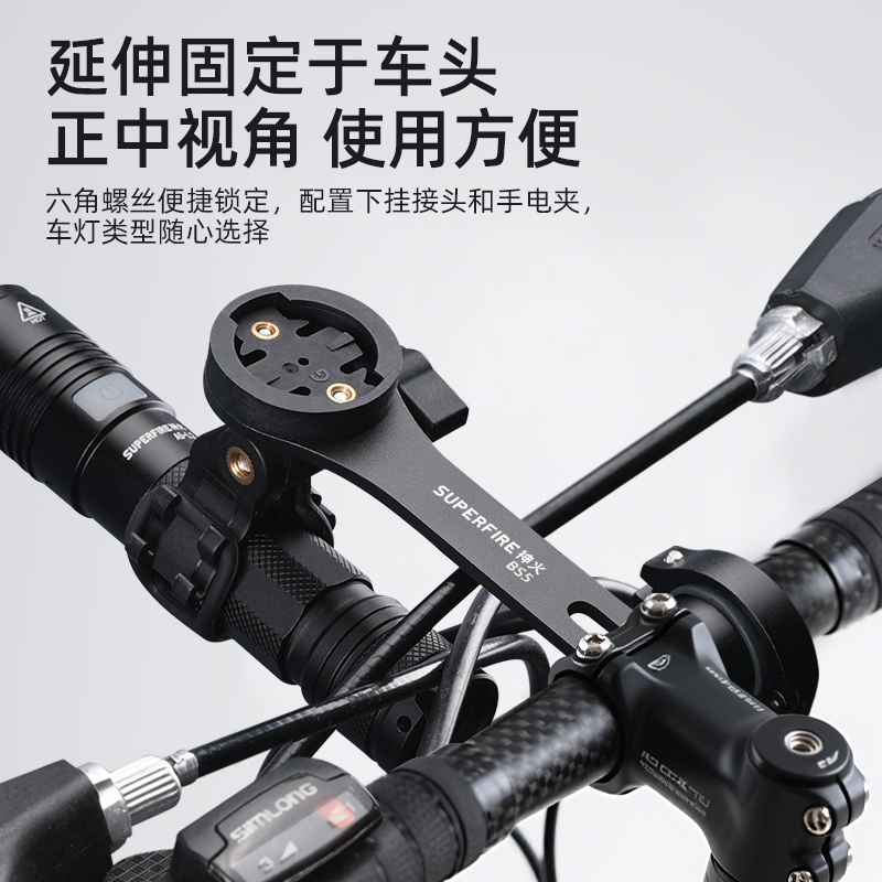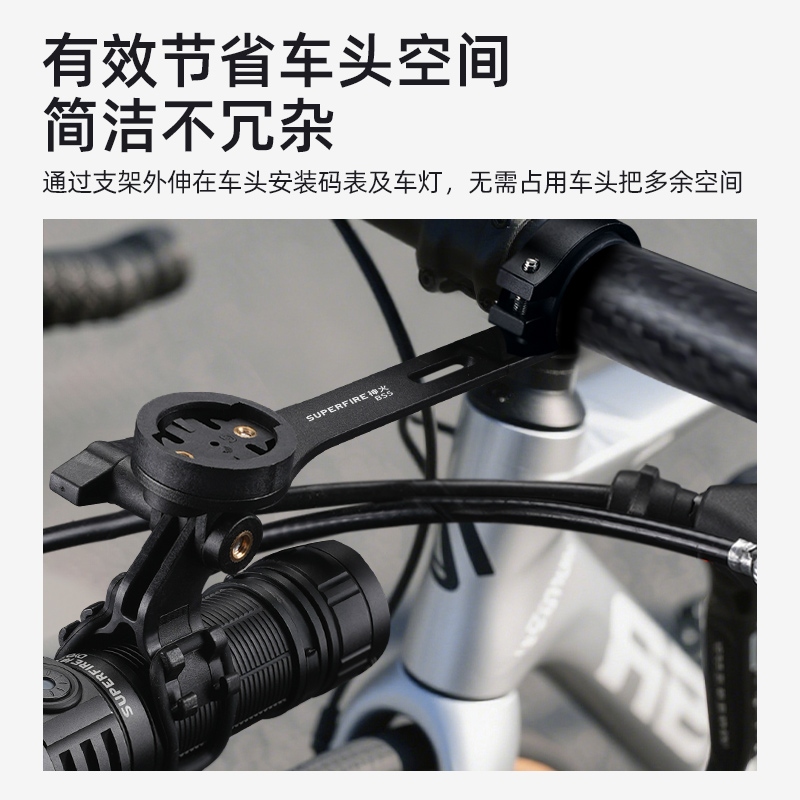 1、通过支架外伸在车头安装码表及车灯,无需占用车头把多余空间;