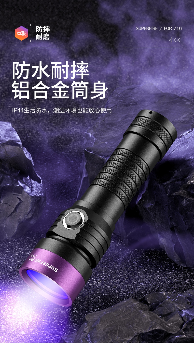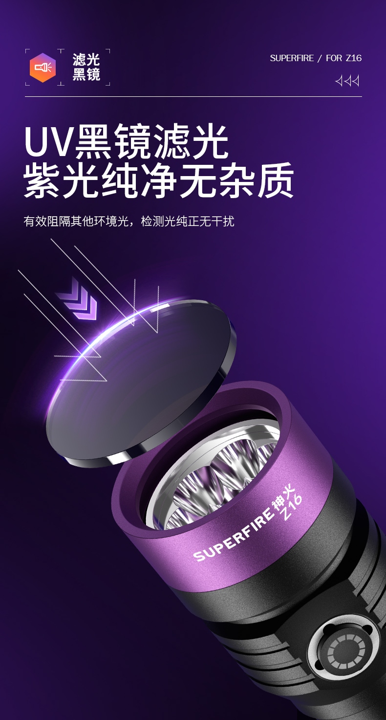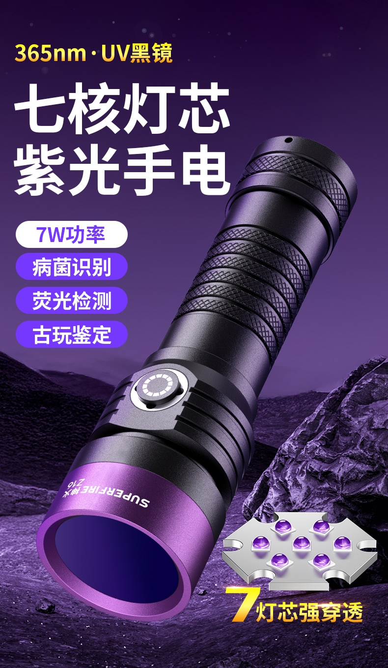 1、紫光手电,配有黑镜:可用于验钞、识别荧光剂,宠物病菌检测,鉴别琥珀、蜜蜡,古玩修补鉴定。
