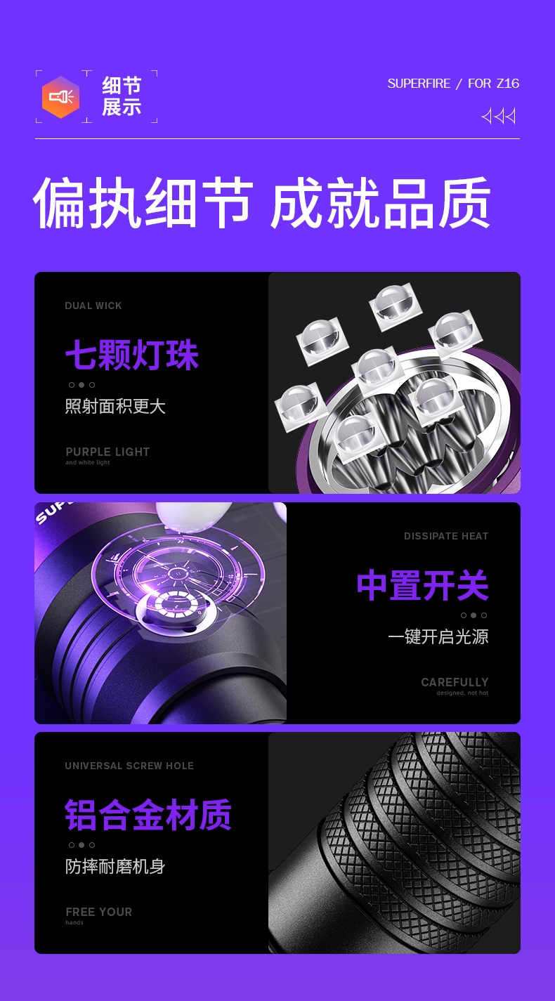 1、紫光手电,配有黑镜:可用于验钞、识别荧光剂,宠物病菌检测,鉴别琥珀、蜜蜡,古玩修补鉴定。 2、单档开关,操作便捷。 3、小巧精致,外出携带更方便。