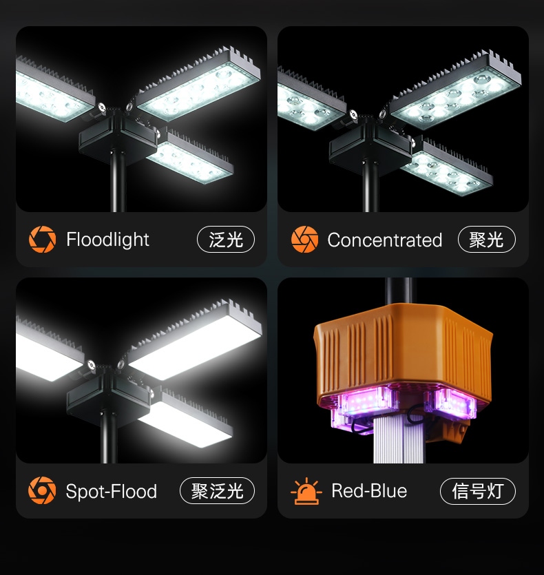 3.2 轻按显示屏左下侧按钮,切换灯具泛聚光照明模式,长按此按键2~3秒开启/关闭信号灯模式;