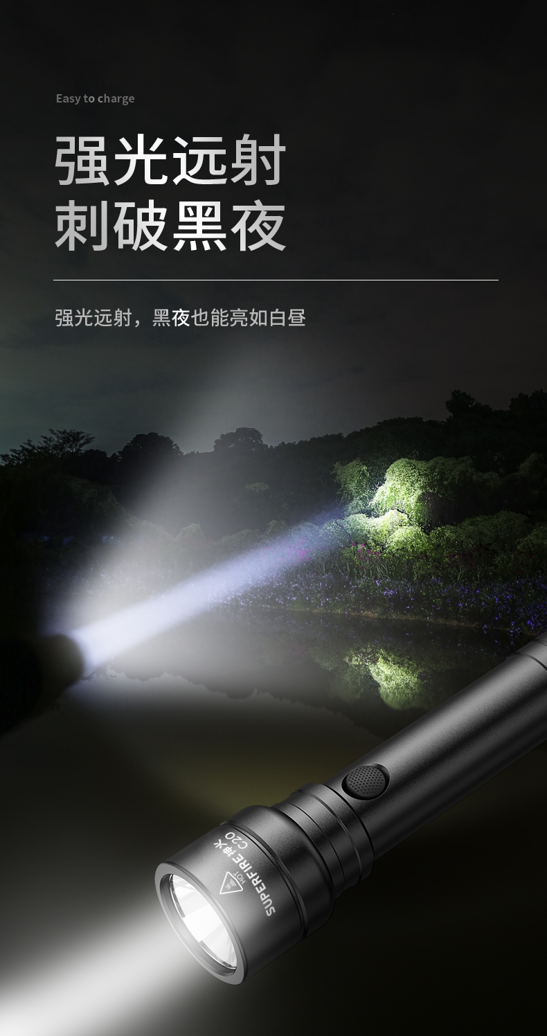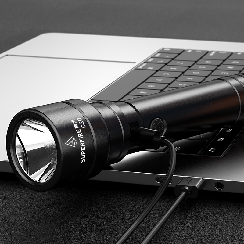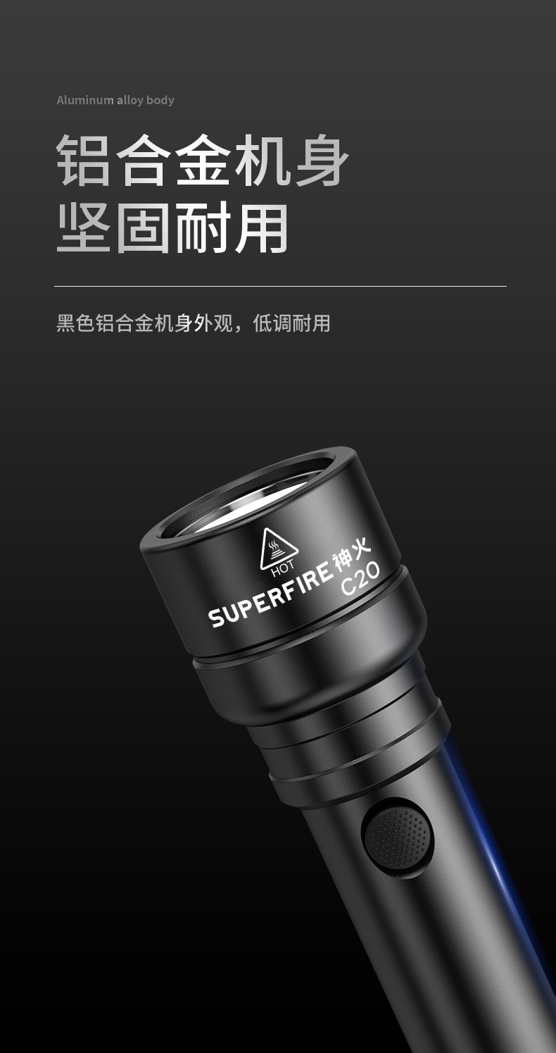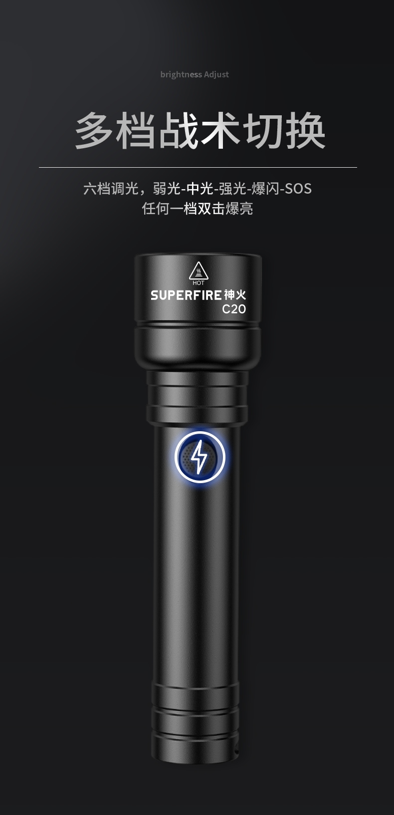 此款采用神火专用灯芯,功率高价格便宜,隐藏式充电孔防水效果更好,超厚外壳完美氧化,配大容量锂电池续航更持久,双击开关打开极亮档,再次双击打开超级亮档,长按开关可关闭。