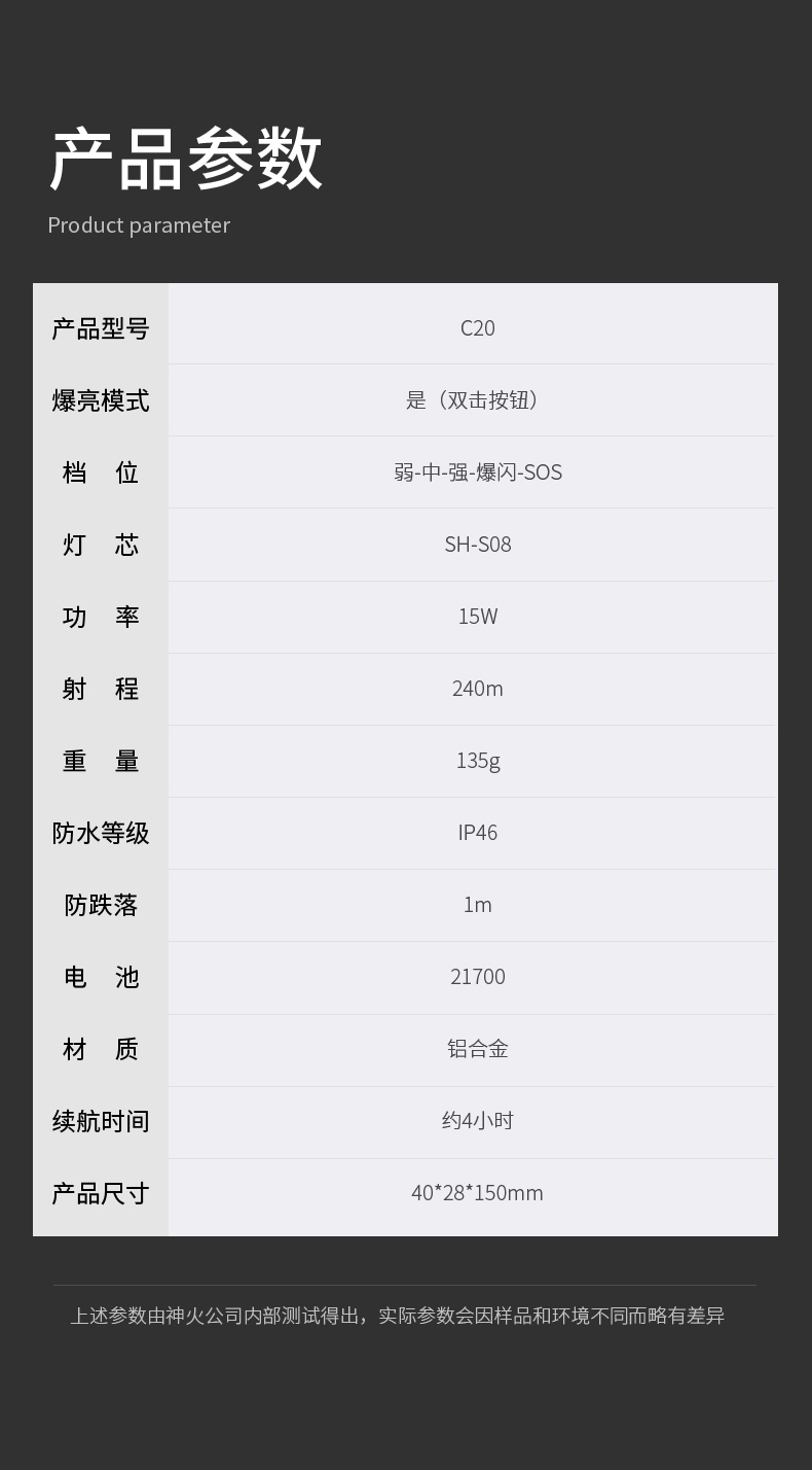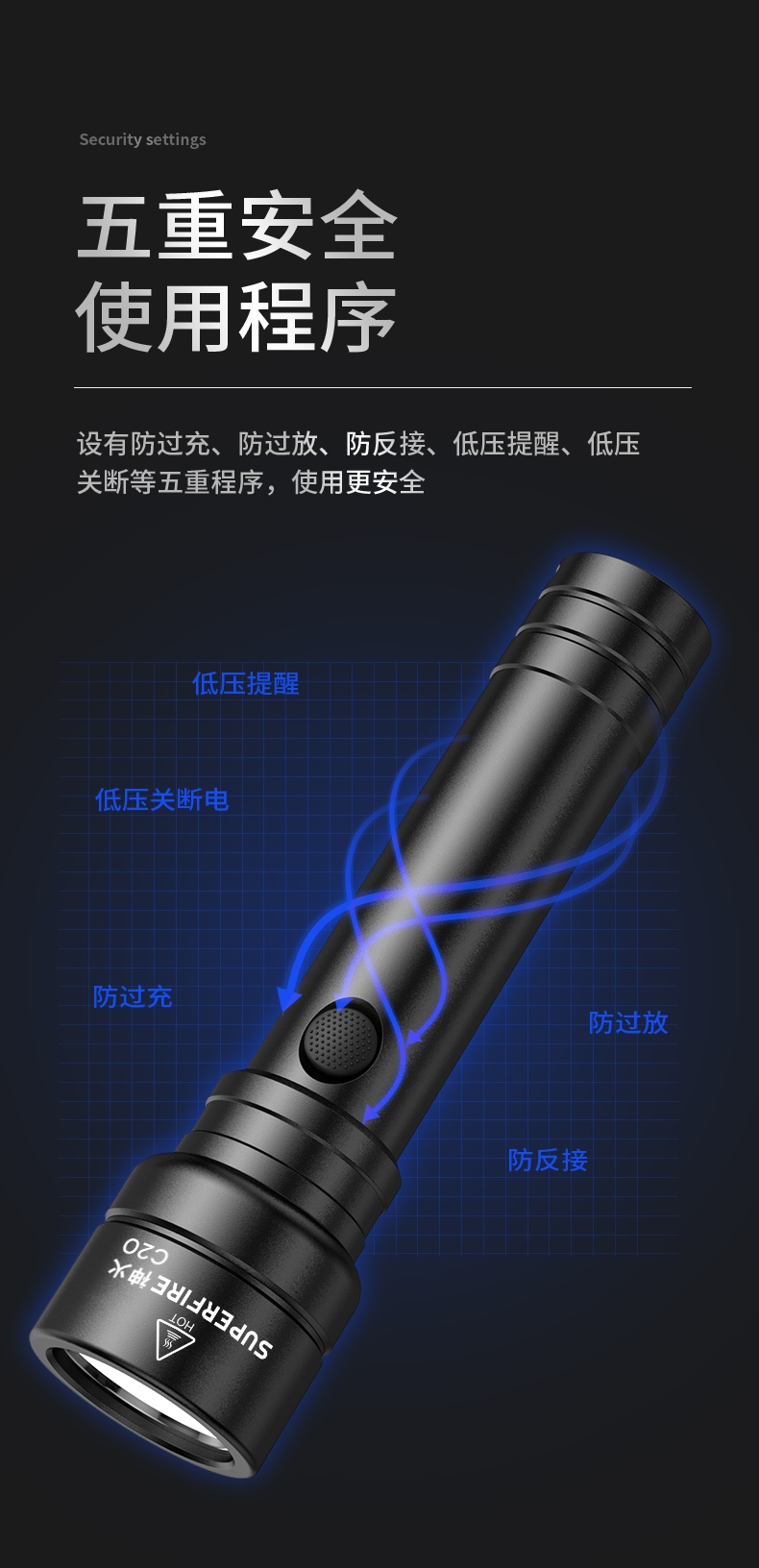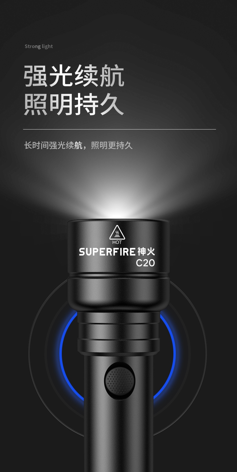 此款采用神火专用灯芯,功率高价格便宜,隐藏式充电孔防水效果更好,超厚外壳完美氧化,配大容量锂电池续航更持久,双击开关打开极亮档,再次双击打开超级亮档,长按开关可关闭。