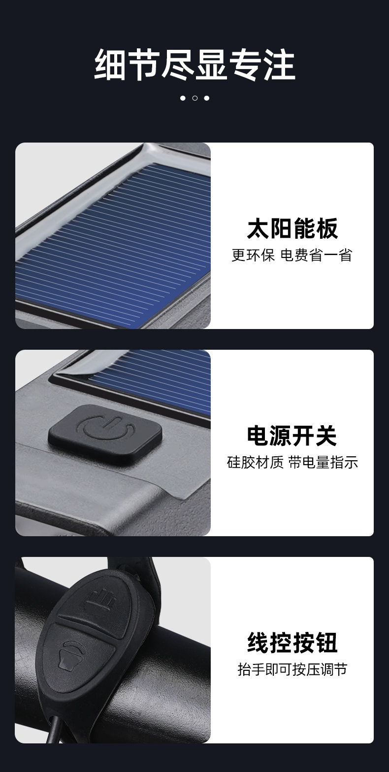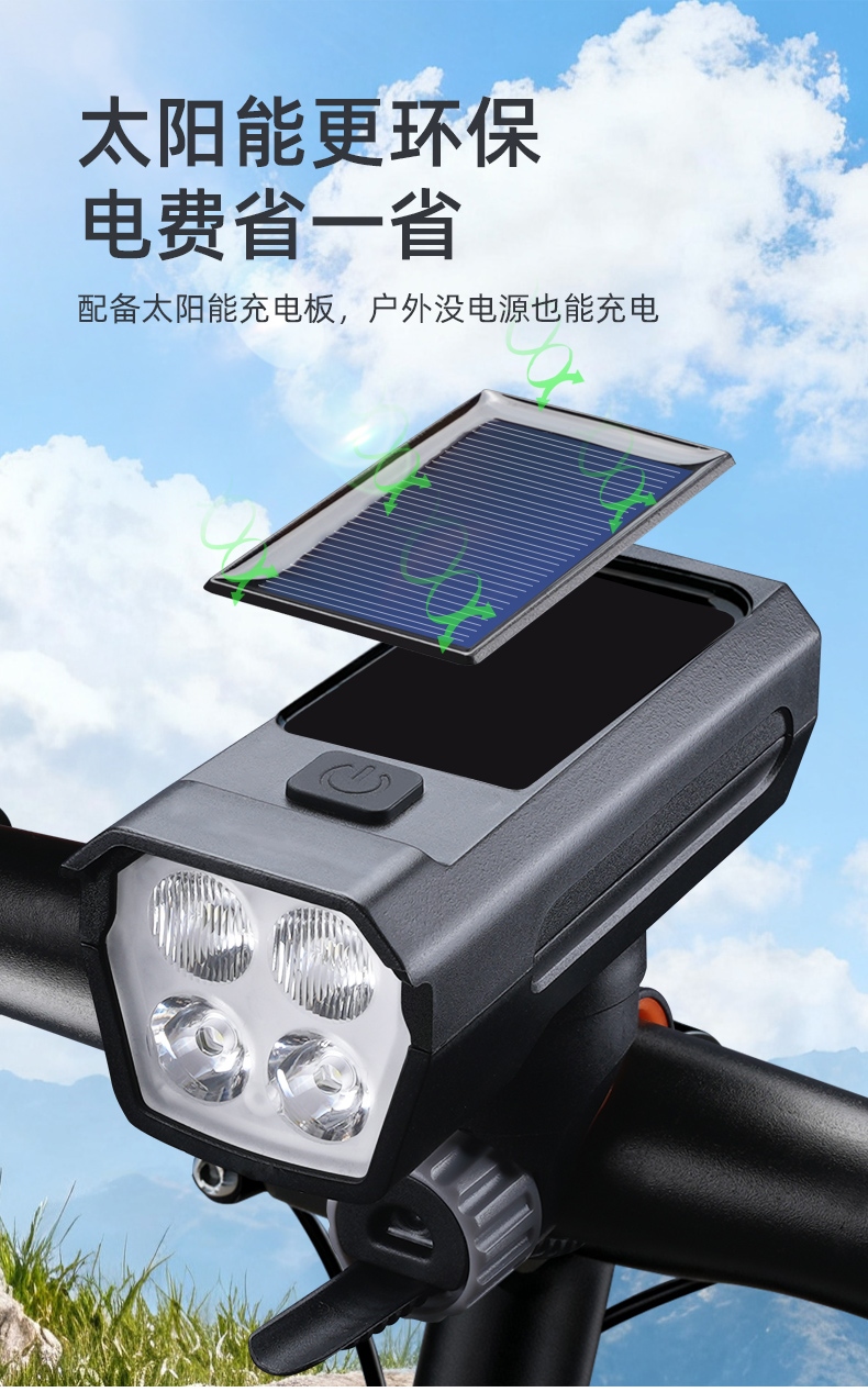 8挡灯光,5种喇叭音效(1米距离可达100分呗),太阳能充电,远近双光,有线遥控.