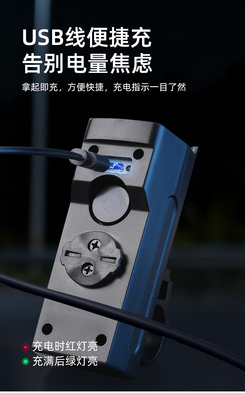 3、充电口带有充电指示灯,充电时亮红灯,充满转绿灯。