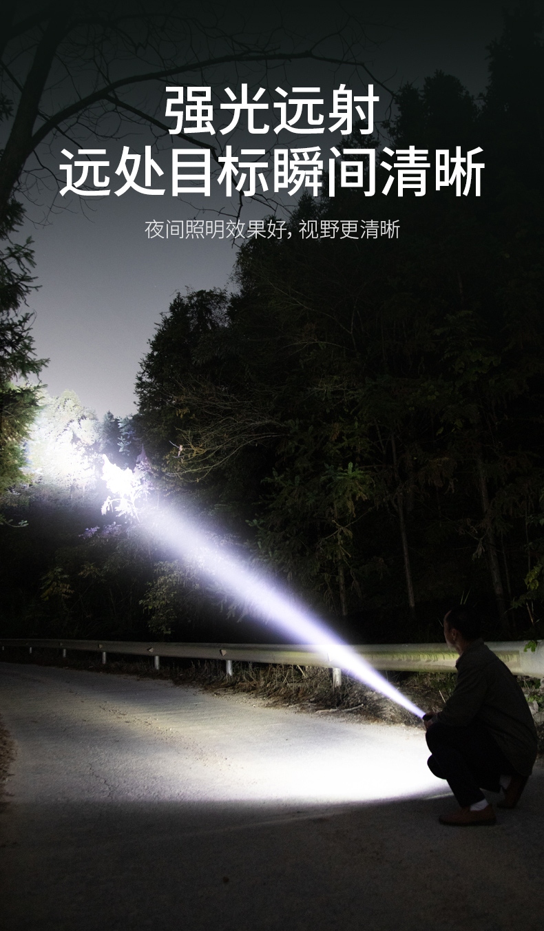 1、千米远射,射程更远,光斑更聚焦。 2、进口灯珠,亮度高,照明效果更好。 3、前后双按键,光源一键点亮,高亮瞬间开启。