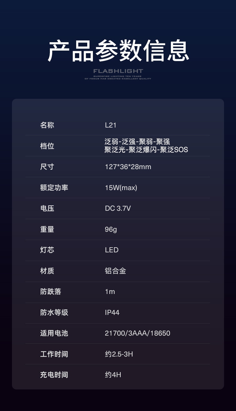 1、多档调光,可满足不同使用场景下的照明需求。 2、多种安全程序,可有效保护手电使用安全,延长手电使用寿命。 3、精致外观,时尚小巧。