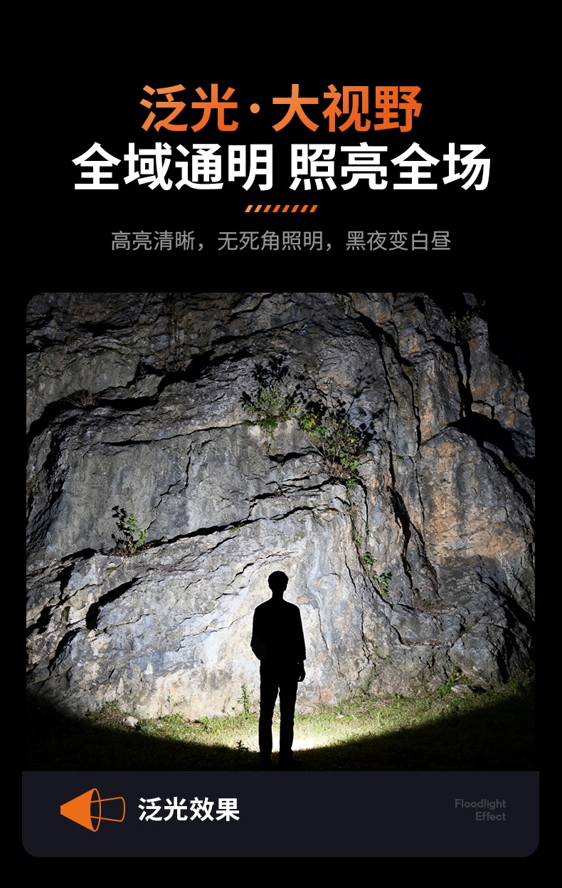 聚光主灯 亮度随心 轻按后端开关按钮,主灯强光点亮,续按依次切换主灯工作光-爆闪光。主灯开启状态下长按5秒,可实现光源色温转换。主灯关闭状态下长按5秒,可开启灯具最亮照明模式。 爆亮强光 亮如白昼 1500LM大功率高亮光源,点亮顷刻如白昼