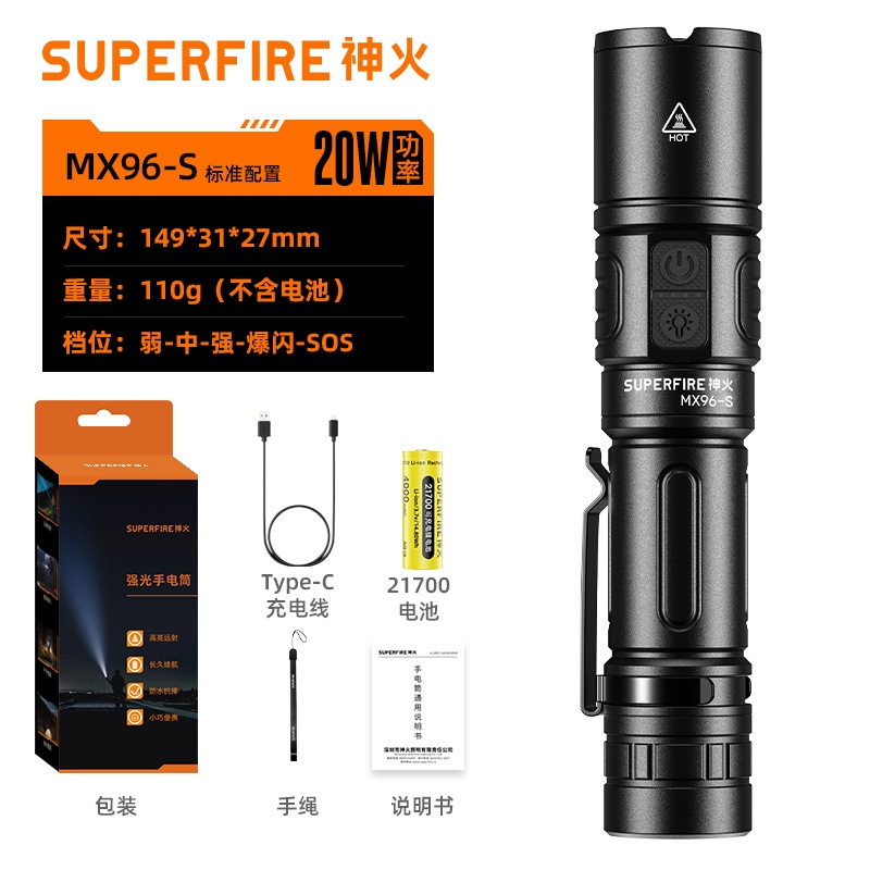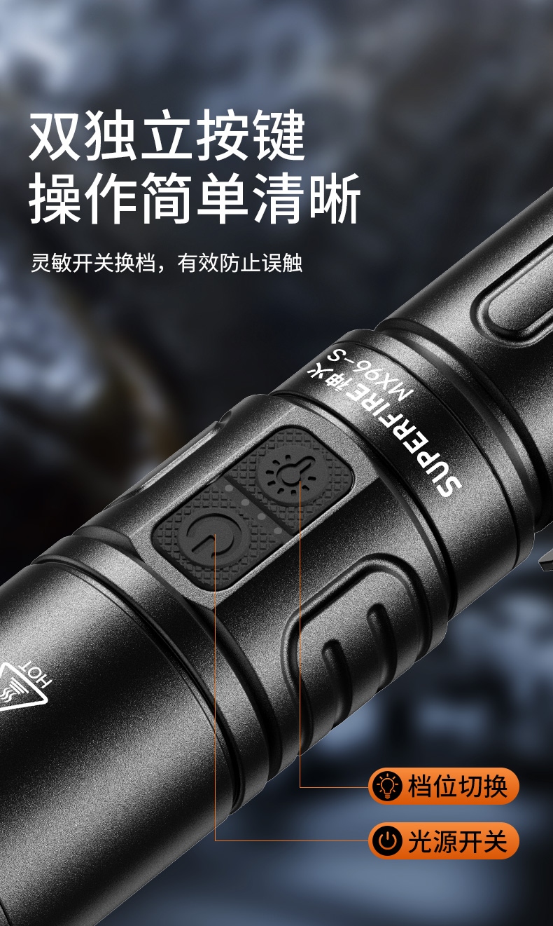 1、千米远射,射程更远,光斑更聚焦。 2、进口灯珠,亮度高,照明效果更好。 3、前后双按键,光源一键点亮,高亮瞬间开启。