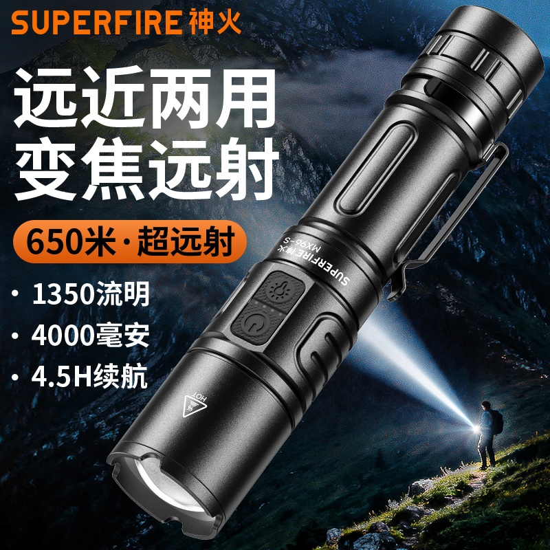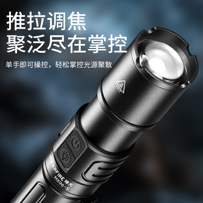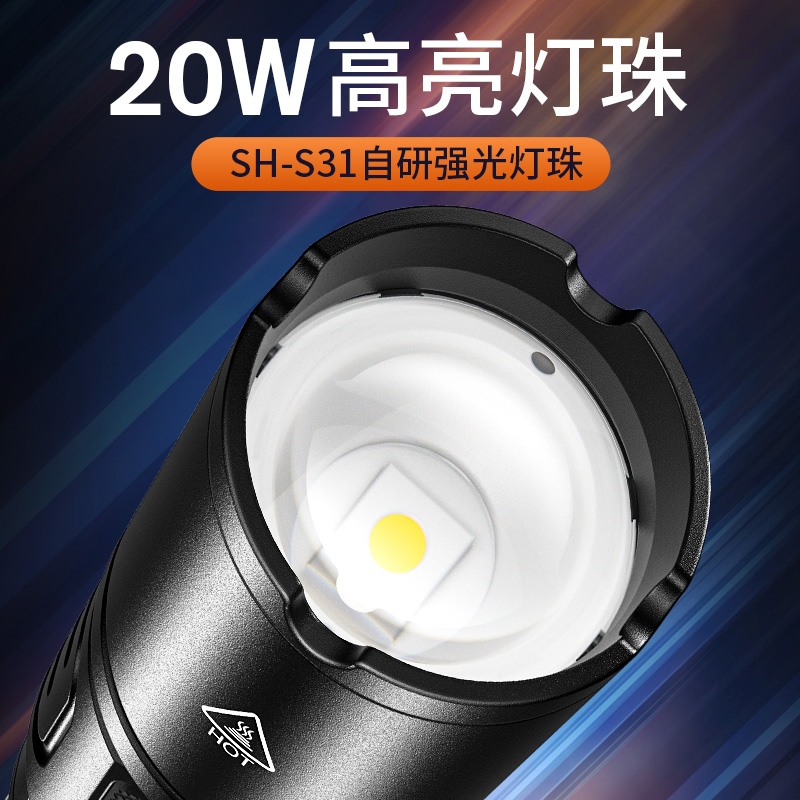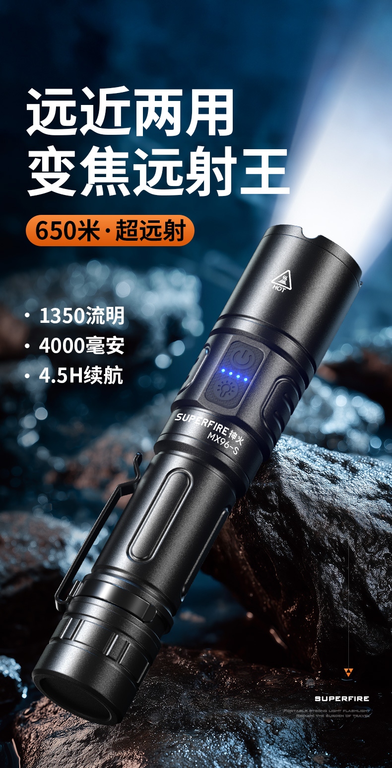 1、大功率灯芯,最高1350Lm最高亮度。 2、远射灯珠,最大650m照射距离。 3、推拉灯头,可实现伸缩调焦。