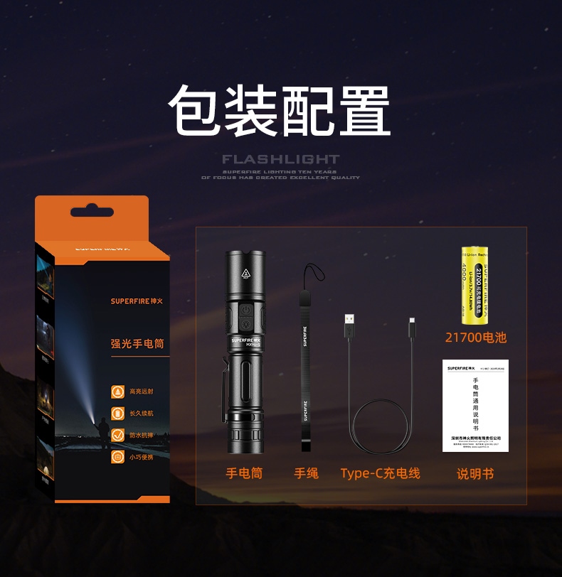 四档调光 Type-C充电 电量显示 铝合金筒身 持久续航 强力防水