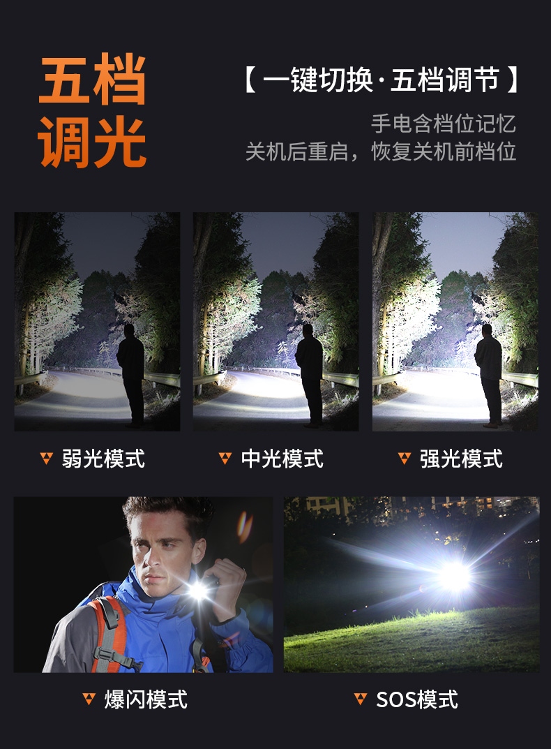 1、六档调光,可满足不同使用场景下的照明需求。 2、进口高亮朗明纳斯灯珠,照明效果更好。 3、含档位记忆,任意档位快捷关机 ,开机恢复关机前档位。