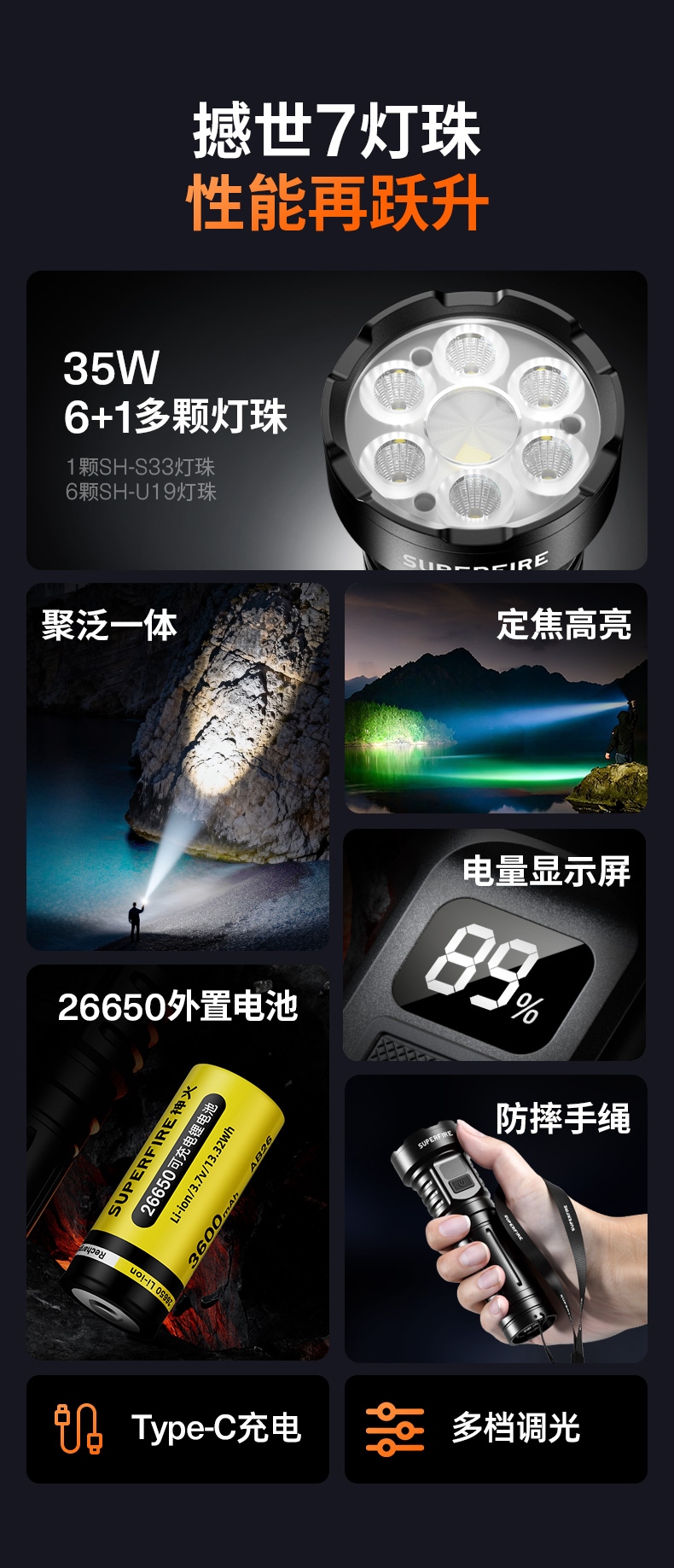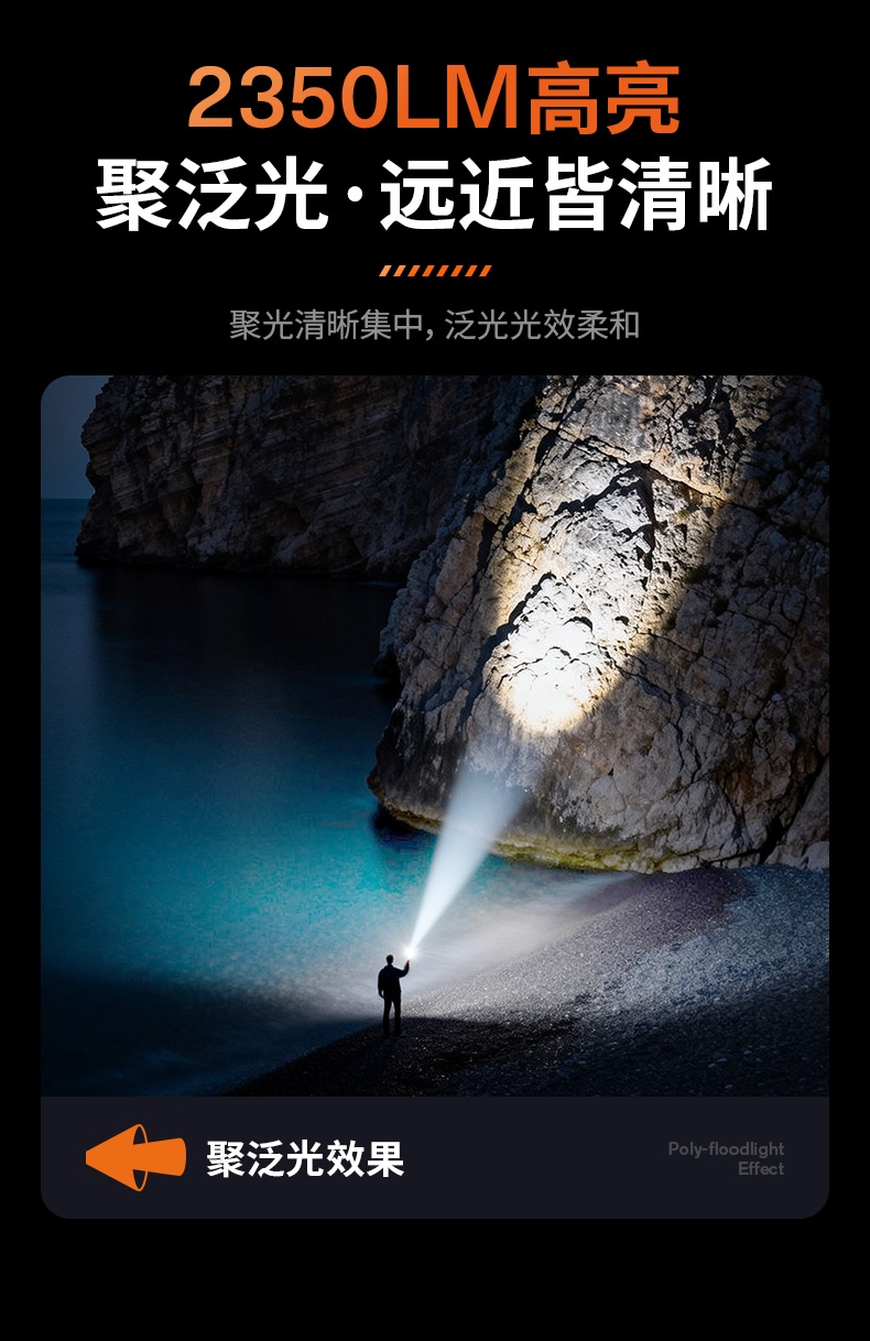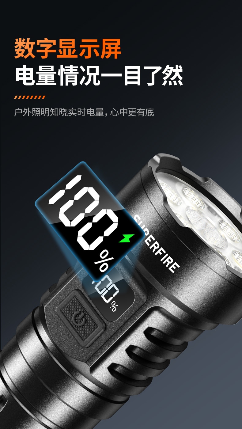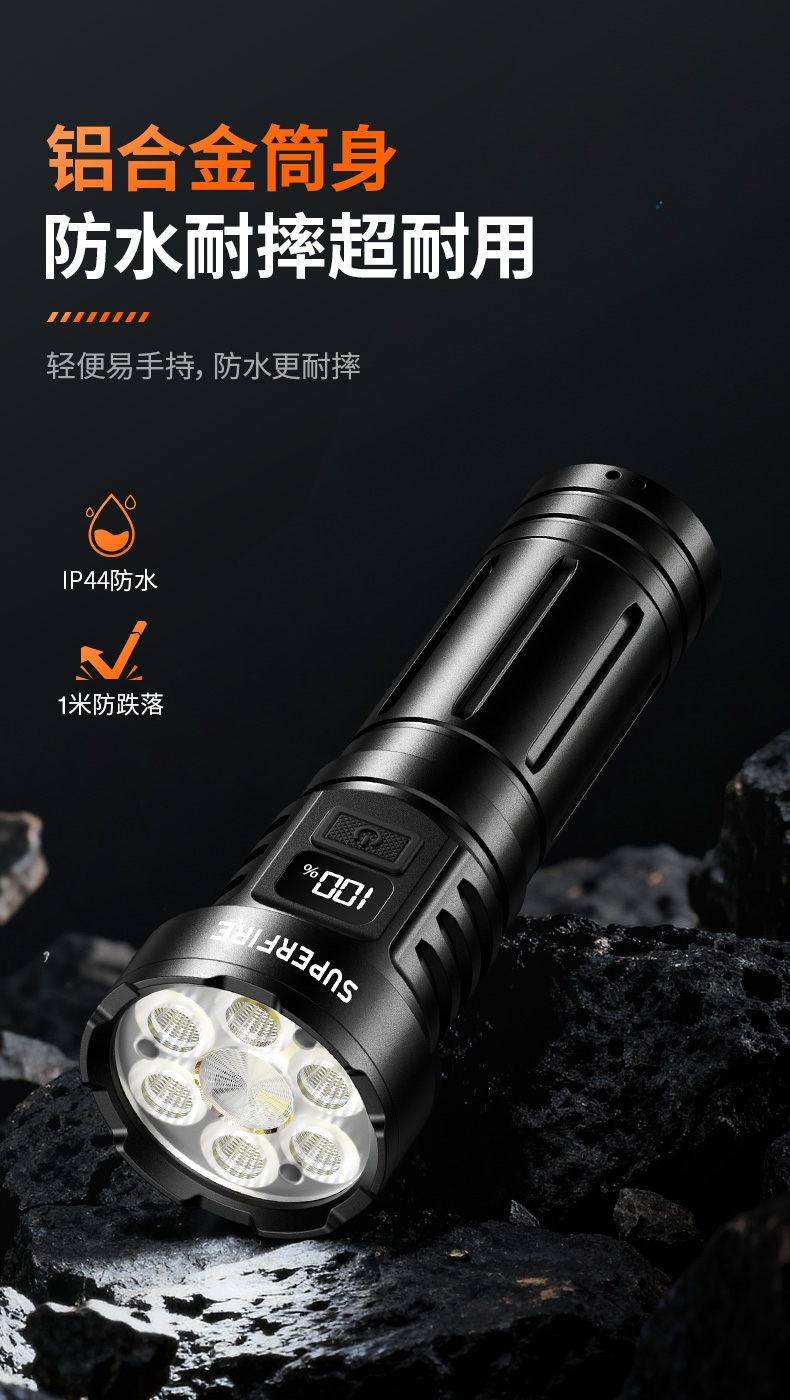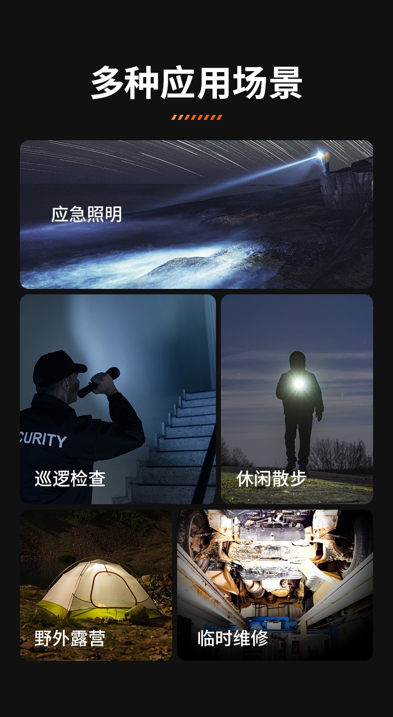1、多颗高亮灯珠,亮度高,照明效果更好。 2、多种安全程序,可有效保护手电使用安全,延长手电使用寿命。 3、聚泛一体,远近兼容。
