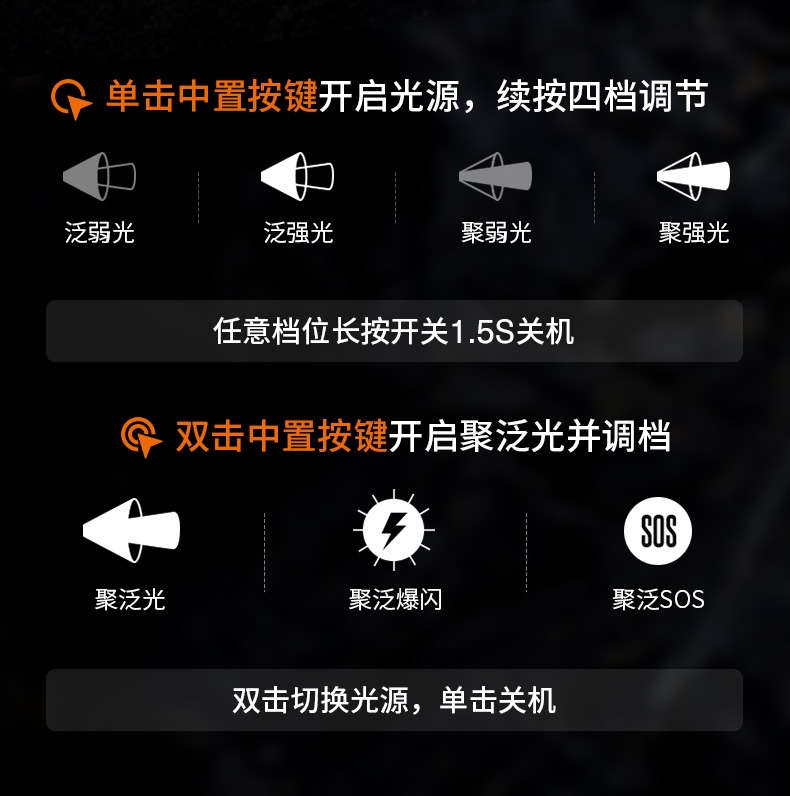 聚光主灯 亮度随心 轻按后端开关按钮,主灯强光点亮,续按依次切换主灯工作光-爆闪光。主灯开启状态下长按5秒,可实现光源色温转换。主灯关闭状态下长按5秒,可开启灯具最亮照明模式。 爆亮强光 亮如白昼 1500LM大功率高亮光源,点亮顷刻如白昼