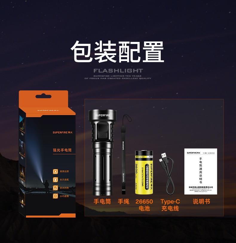 四档调光 Type-C充电 电量显示 铝合金筒身 持久续航 强力防水