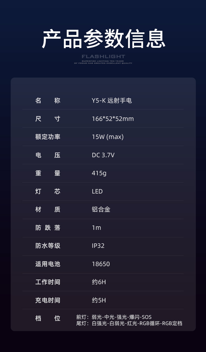 1、多档前灯(弱光-中光-强光-爆闪-SOS)、后灯(白强光-白弱光-红光-RGB循环-RGB定档),可满足多场景下的