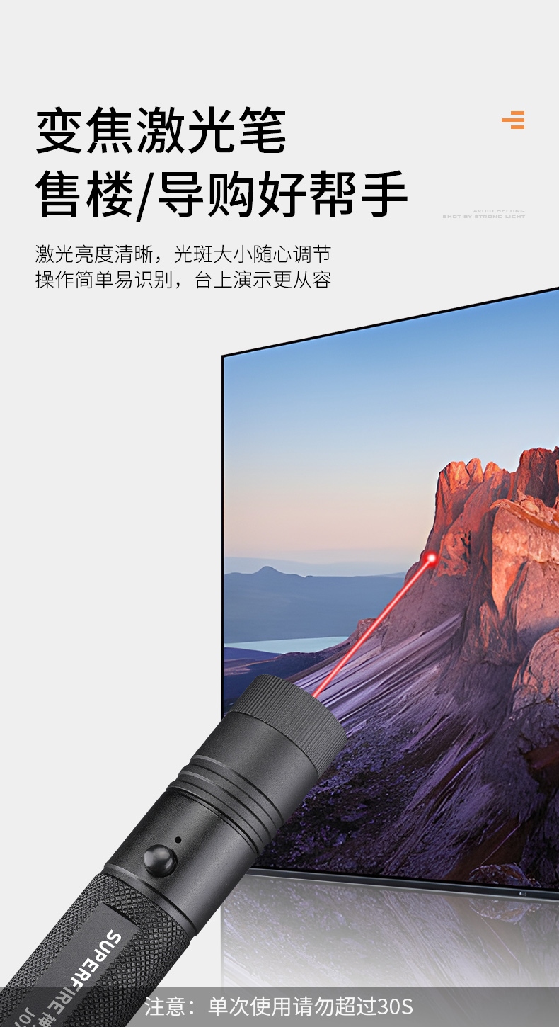 1、单射灯模式,红色激光笔可用于会议及教案宣讲,重点信息指引; 2、十字射灯模式,灯光绚丽,可玩性强。 3、铝合金外壳,稳定性好,耐压耐摔耐高温。 4、3B类激光,千米远射,光色纯,功耗低。 5、可调焦,光斑大小可调。