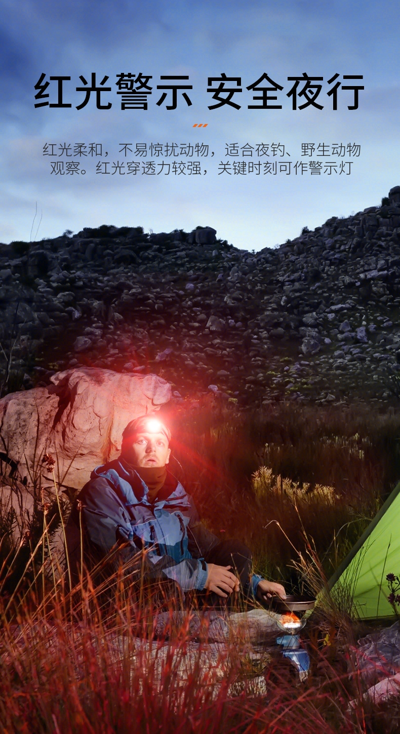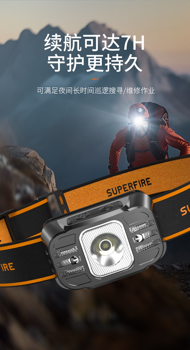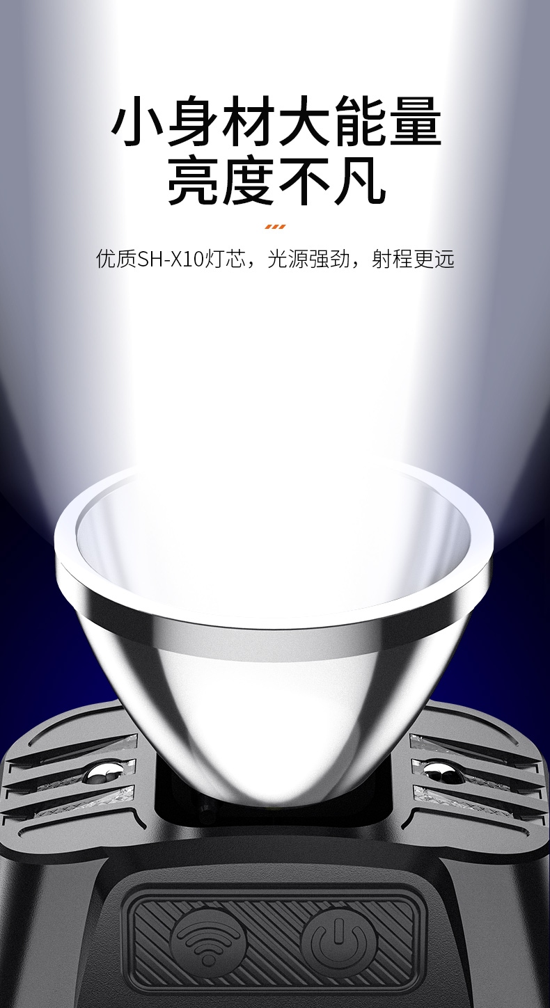 强光亮度,运动头灯,前后均衡设计,轻便不压头,可调节式头灯带,佩戴方便舒适,伸缩调焦,光照范围大,照射距离远,头灯角度调节,超90度角度随意调节,适宜各种环境使用