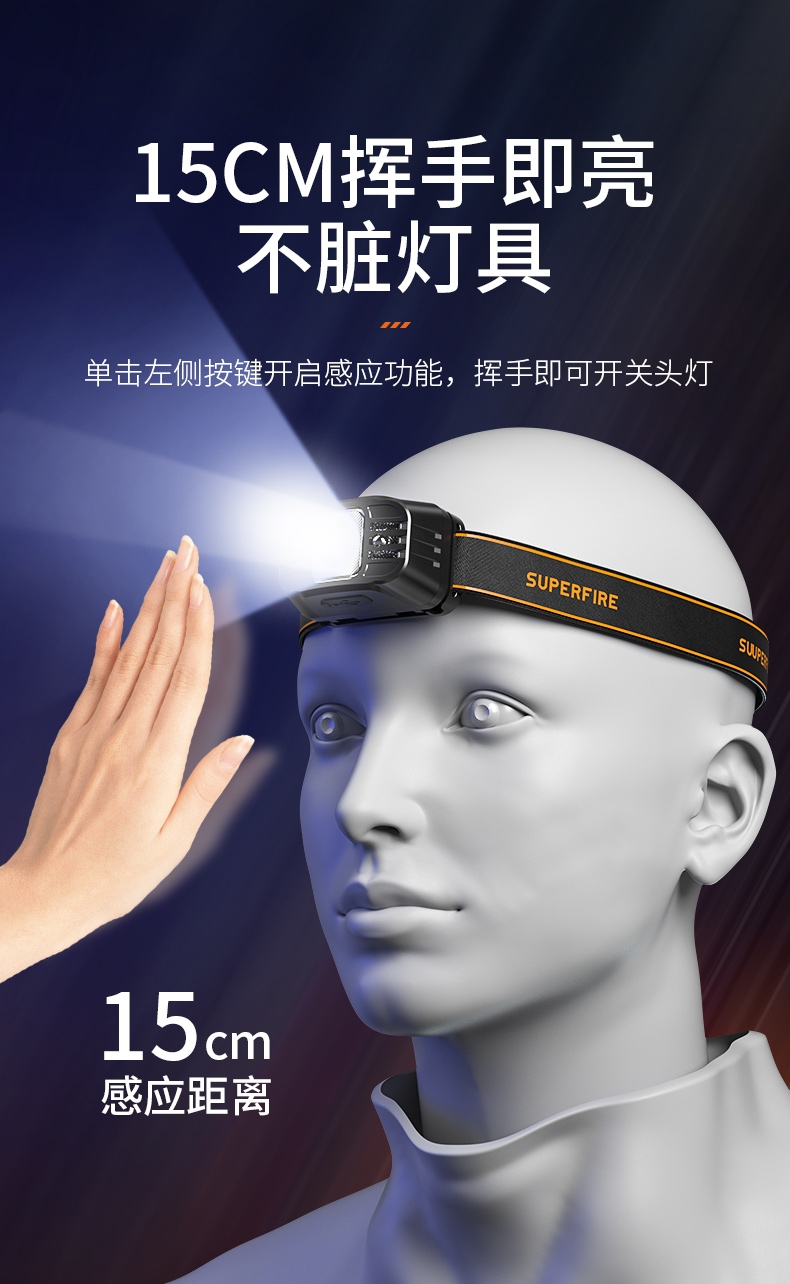1、单击左边开关开启感应功能,续按关闭感应功能,当感应功能开启时,单击右边开关可正常调节档位。 2、充电时红色指示灯常亮,充满时蓝色指示灯常亮。 3、此款头灯款式潮流、设计小巧、携带方便、头带材质柔软、可自由拆卸、便于清洗。