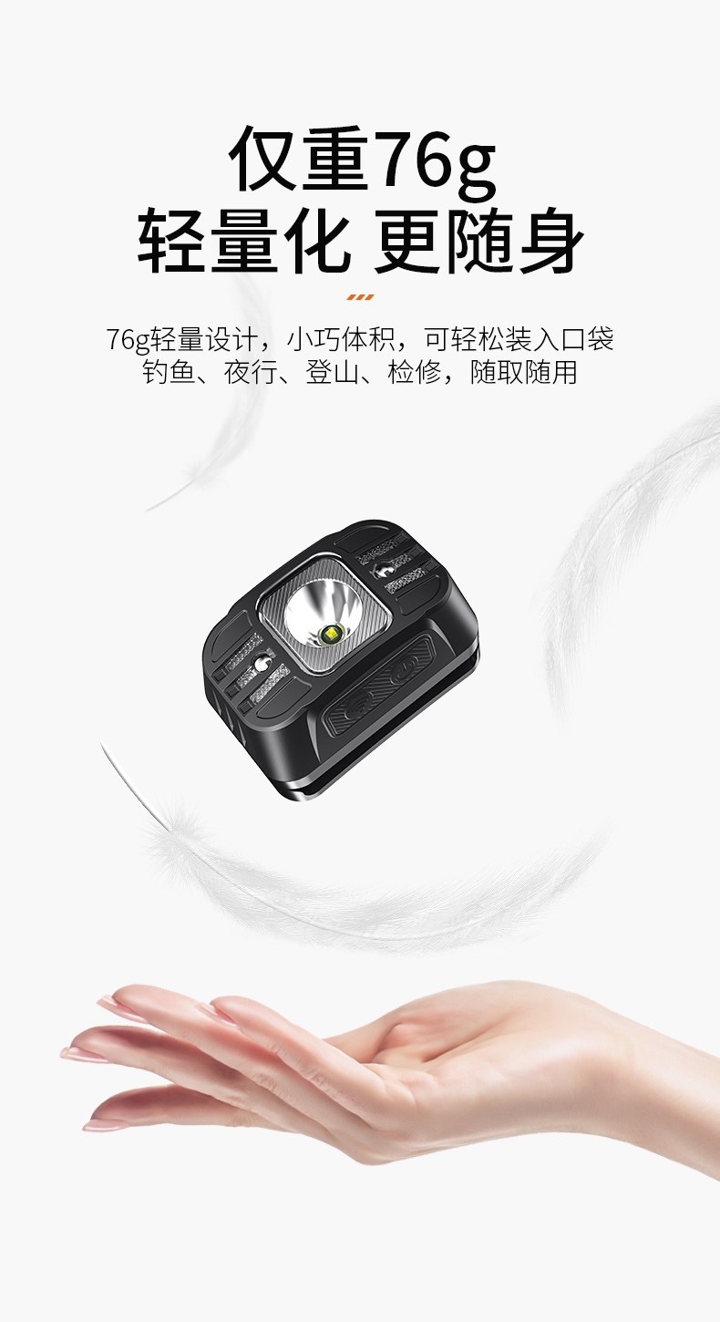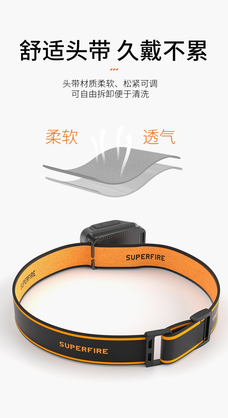 5、此款头灯款式潮流、设计小巧、携带方便、头带材质柔软、可自由拆卸、便于清洗。