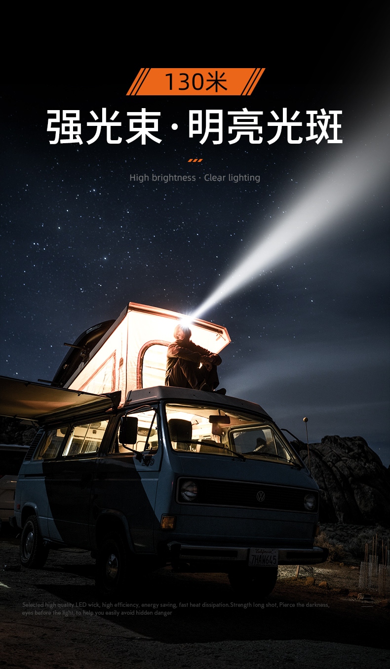 1、多档调光,可满足不同使用场景下的照明需求; 2、含提手,握感更舒适。携带更简单; 3、新型高亮远射灯珠,60W大功率,亮度高,照明效果好。