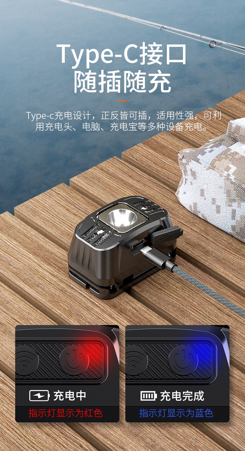 4、多样化充电,使用方便;设有USB充电接口,可使用充电器、充电宝、电脑等设备为灯具充电。