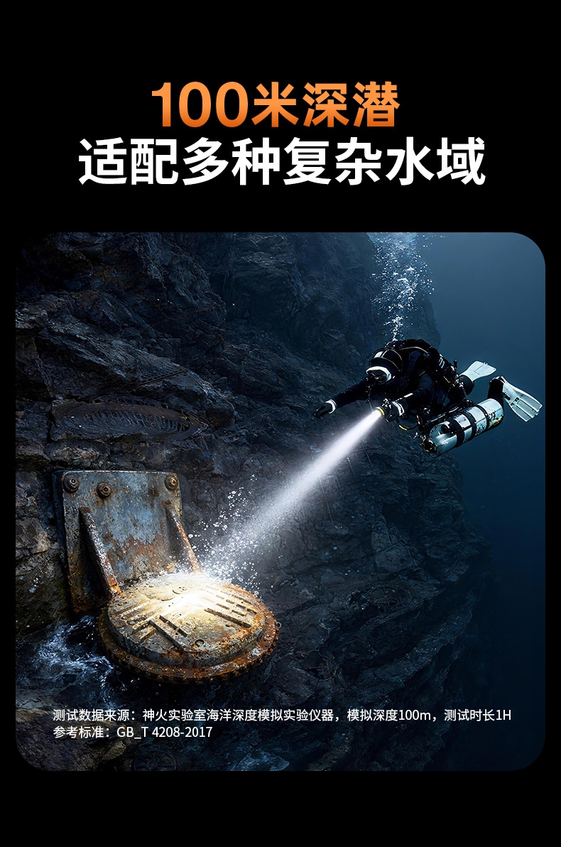 专业级防水设计:经过严格测试,达到IP68标准,能够承受深达100米甚至更深的水压,是深海探索的理想选择。 坚固耐用材料:外壳使用航空级铝合金制造,具备出色的抗冲击和耐腐蚀性能,适合各种恶劣环境下的使用。