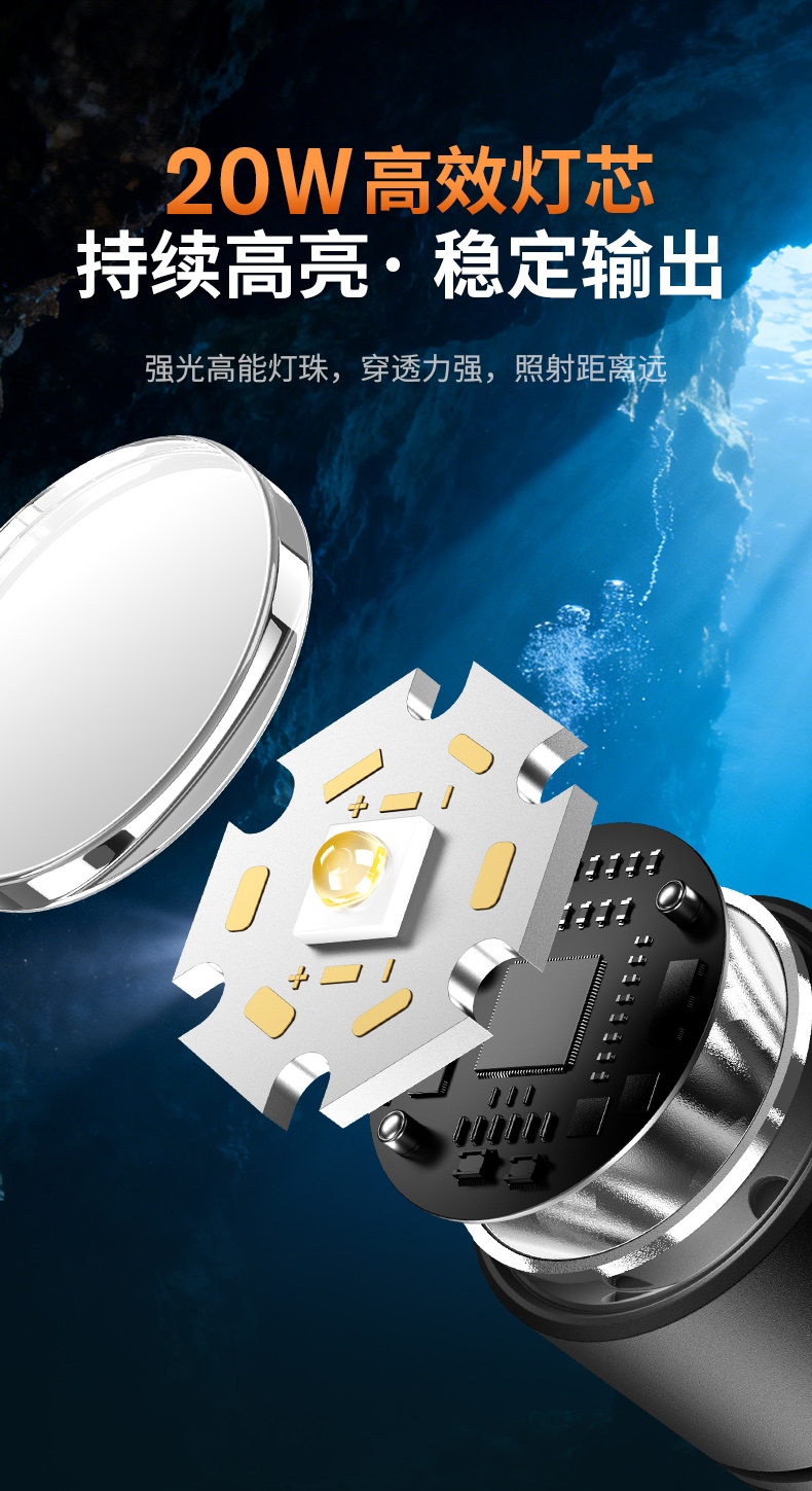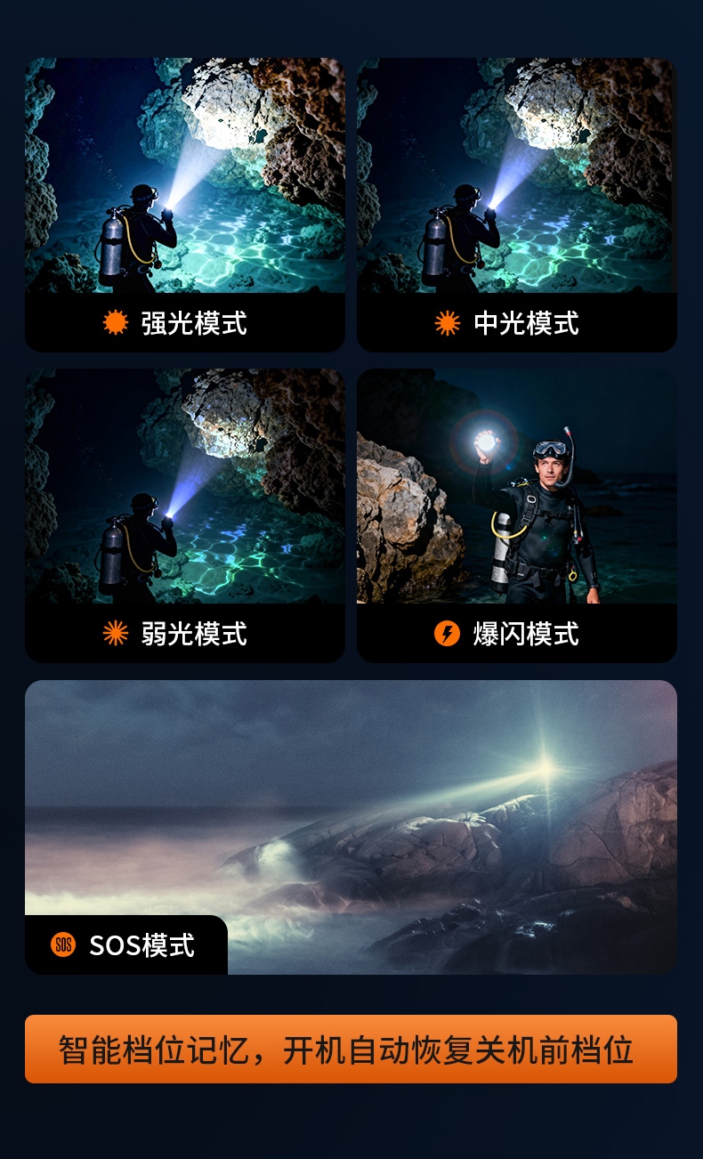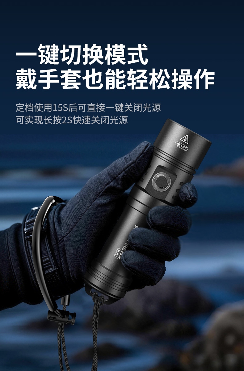 便携开关操作:按钮式设计,即使穿戴潜水手套也能轻松操作,同时具备多种光照模式切换功能。