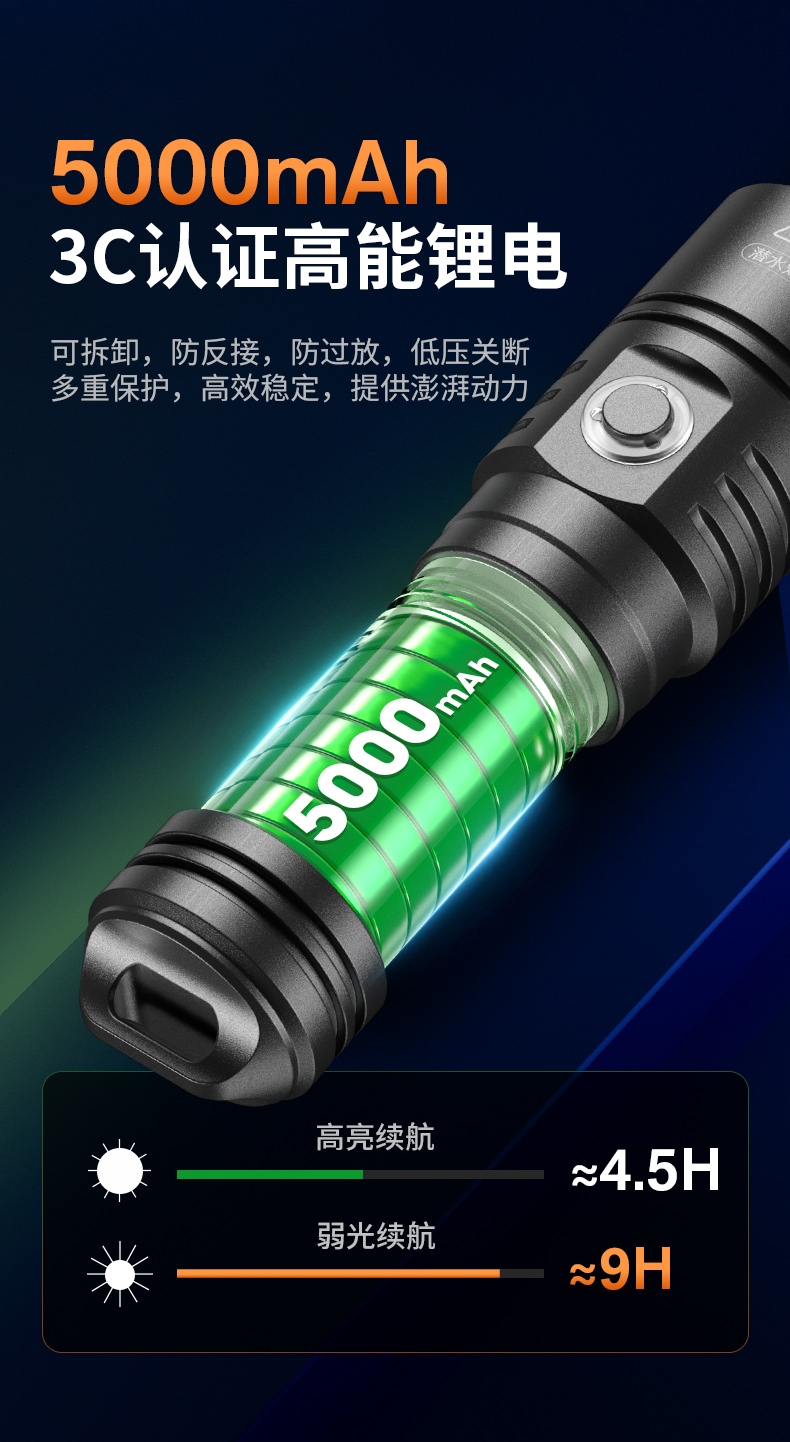 1、千米远射,射程更远,光斑更聚焦。 2、进口灯珠,亮度高,照明效果更好。 3、前后双按键,光源一键点亮,高亮瞬间开启。