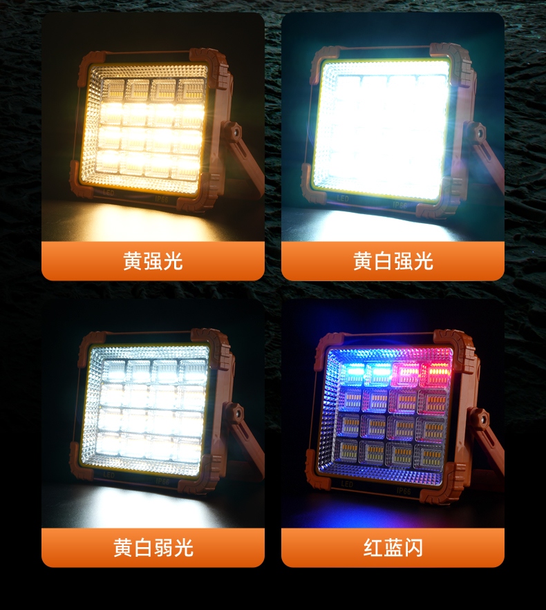 1、白光强、黄强光、黄白强光、黄白弱光、红蓝闪(警示灯)五档调节,可满足不同场景下的使用需求。 2、多样化充电,使用方便:设有Type-c充电口,可使用充电器、充电宝、电脑等设备为灯具充电。 3、此款投光灯背面带有挂钩、支架、强磁、使用方便。