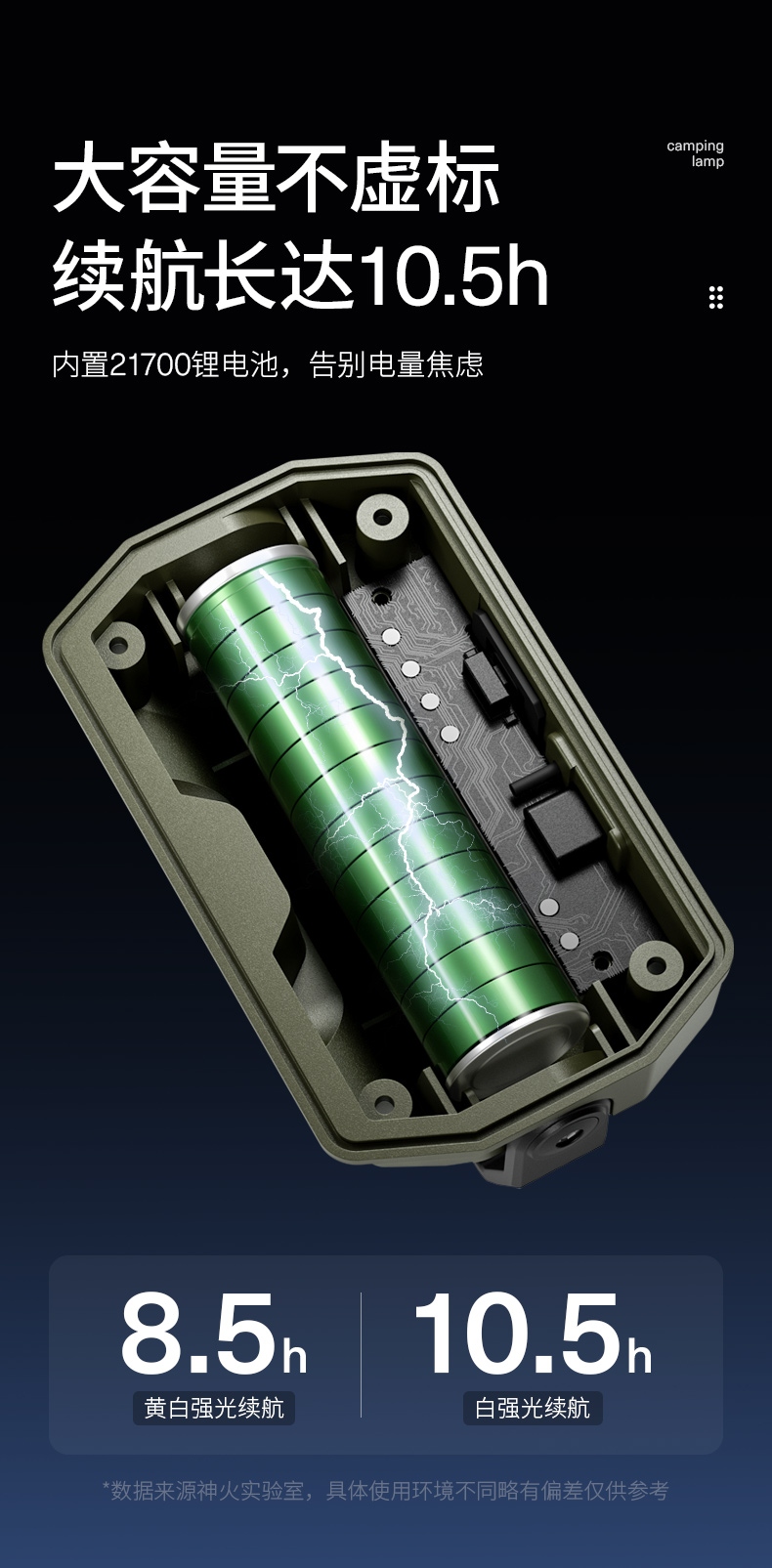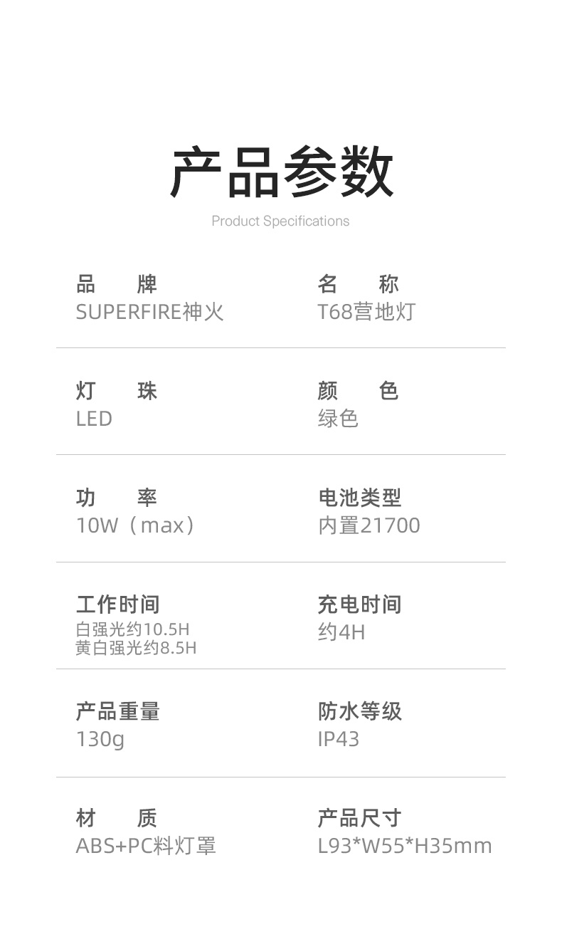 续航时间(H)白强光约10.5H、黄白强光约8.5H