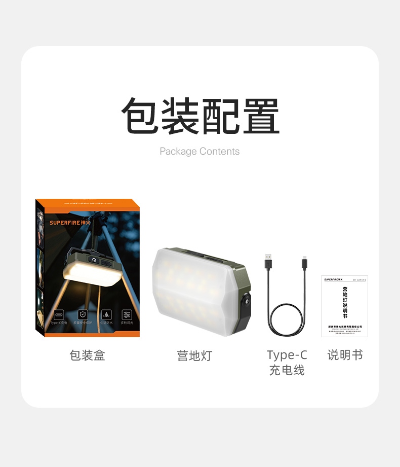 3、多样化充电,使用方便;设有type-c充电接口,可使用充电器、充电宝、电脑等设备为灯具充电。