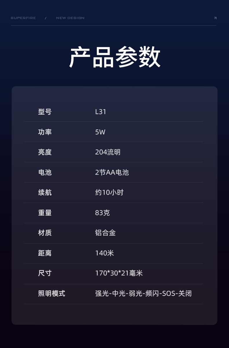 1、多档调光,满足不同使用环境下的照明需求。 2、配AA干电池,可随时替换,续航更长久。 3、铝合金筒身,防摔抗击。