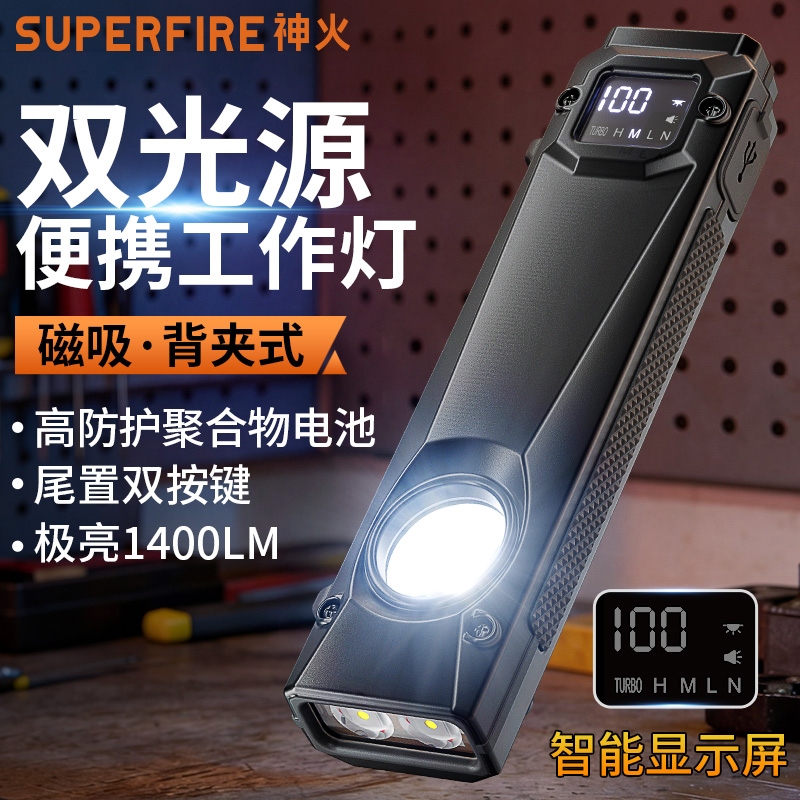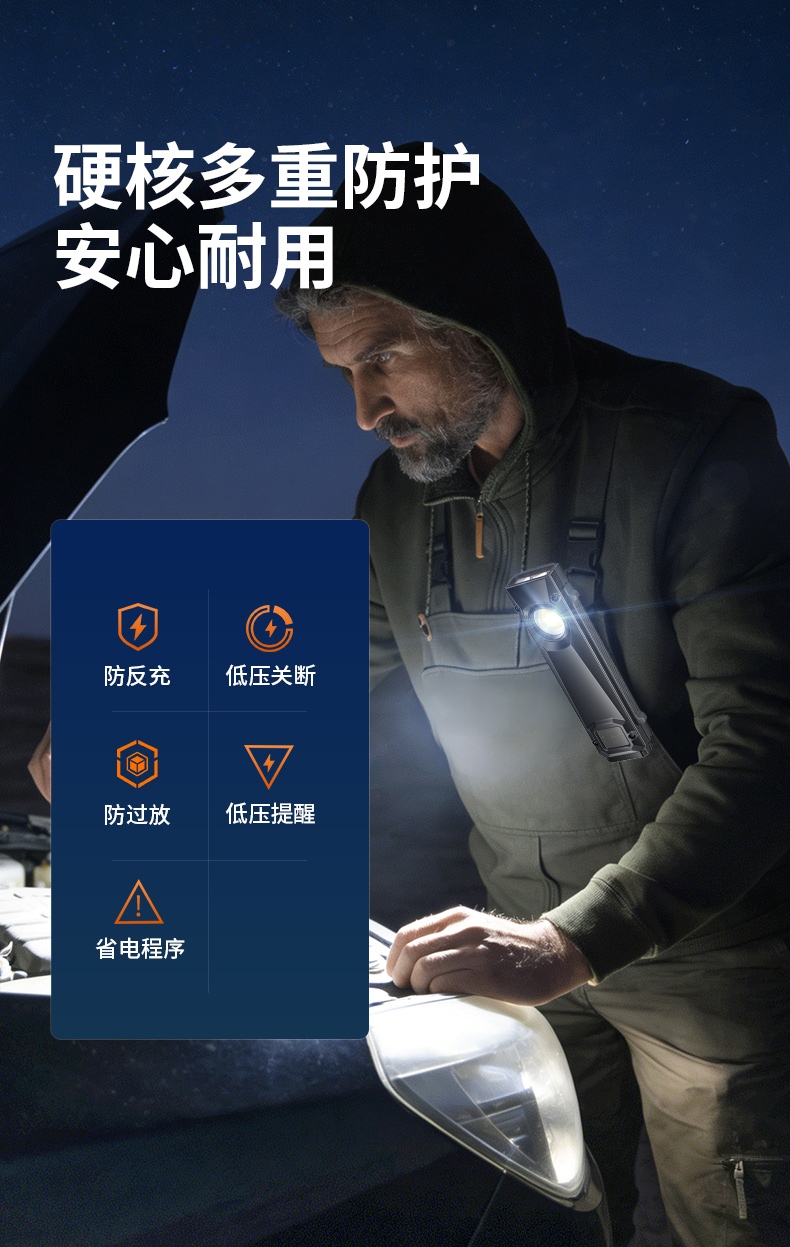 1、自动记忆:此款工作灯有记忆功能,自动记忆上次关闭前的光源及档位 ; 2、设有数字电量显示,智能数显(00-100%),充电时闪烁,充满常亮; 3、多重安全使用程序:设有防过充、防过放、低压提醒、等多重程序,使用安全。