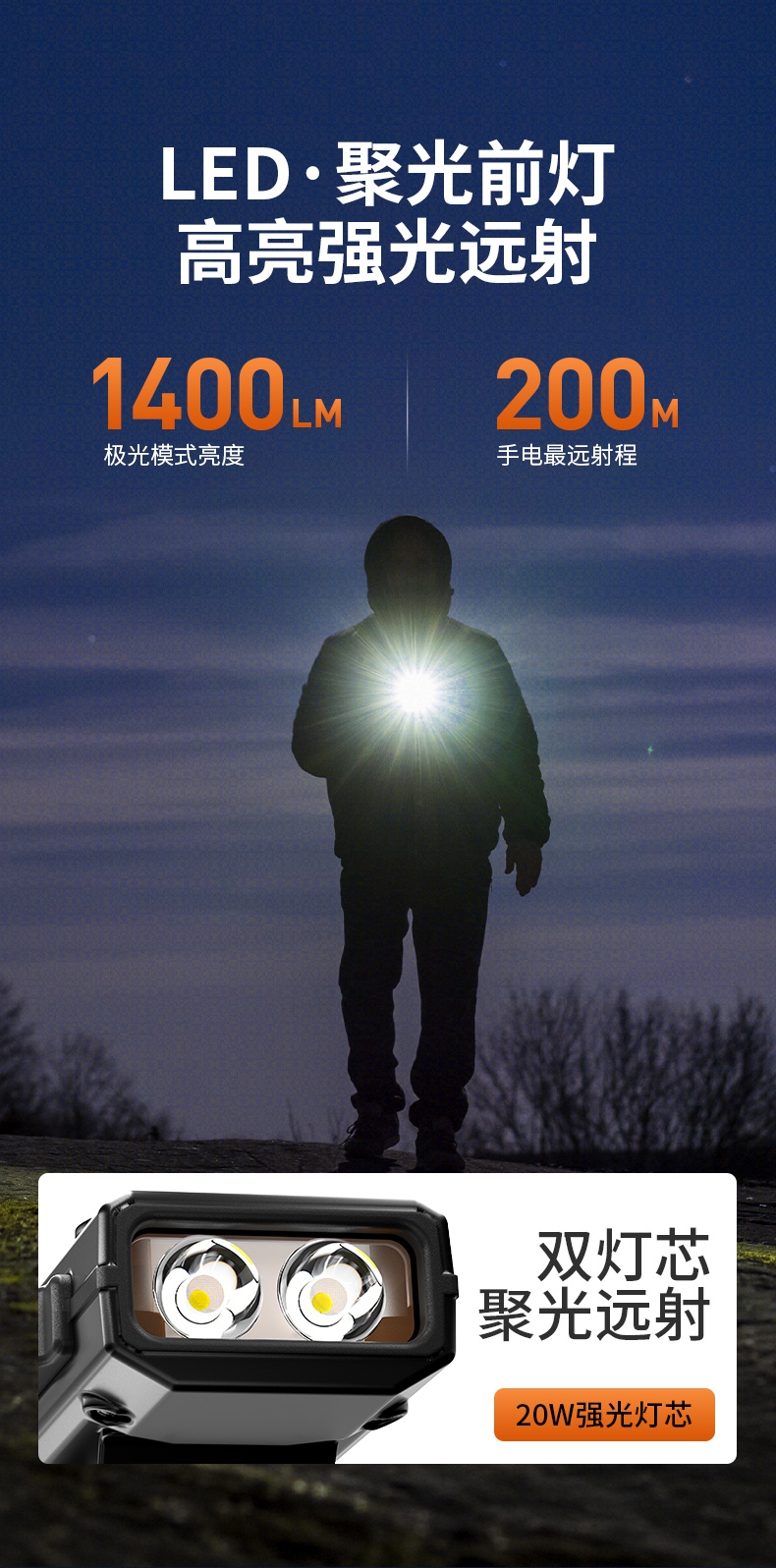 强光亮度,运动头灯,前后均衡设计,轻便不压头,可调节式头灯带,佩戴方便舒适,伸缩调焦,光照范围大,照射距离远,头灯角度调节,超90度角度随意调节,适宜各种环境使用
