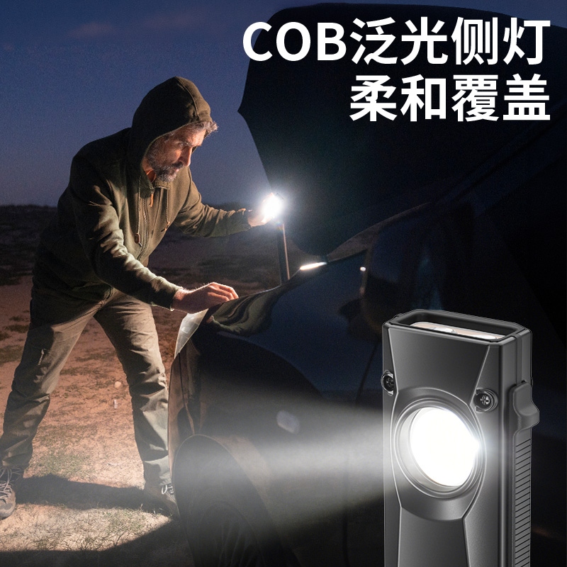 聚光主灯 亮度随心 轻按后端开关按钮,主灯强光点亮,续按依次切换主灯工作光-爆闪光。主灯开启状态下长按5秒,可实现光源色温转换。主灯关闭状态下长按5秒,可开启灯具最亮照明模式。 爆亮强光 亮如白昼 1500LM大功率高亮光源,点亮顷刻如白昼
