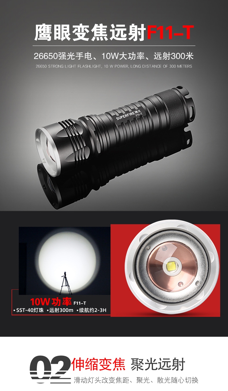 1、千米远射,射程更远,光斑更聚焦。 2、进口灯珠,亮度高,照明效果更好。 3、前后双按键,光源一键点亮,高亮瞬间开启。