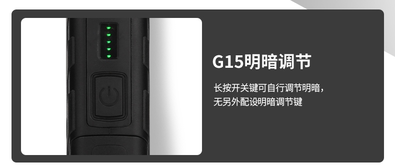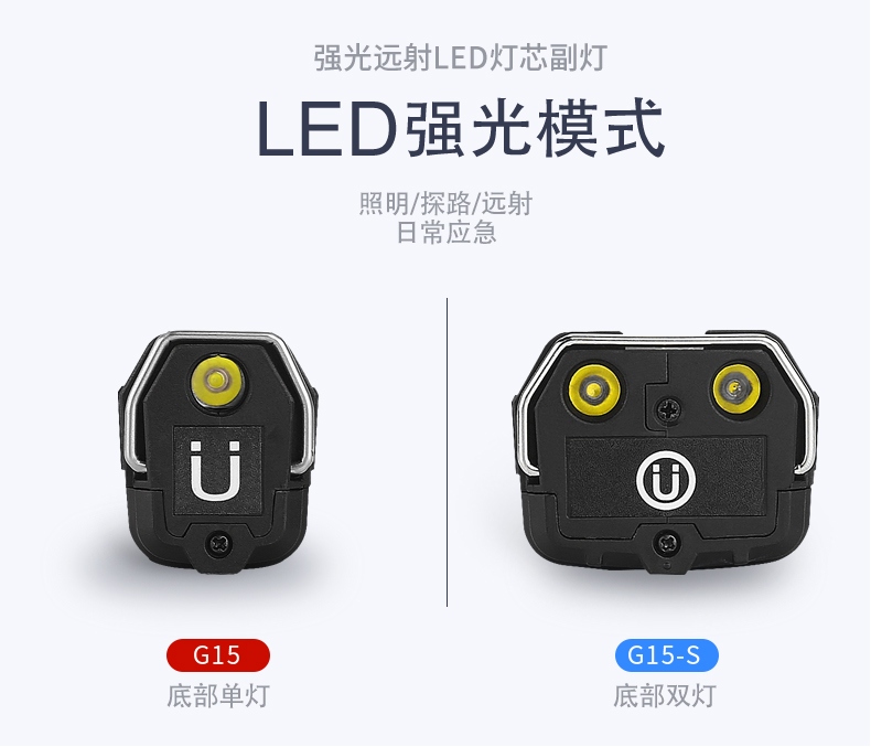 聚光主灯 亮度随心 轻按后端开关按钮,主灯强光点亮,续按依次切换主灯工作光-爆闪光。主灯开启状态下长按5秒,可实现光源色温转换。主灯关闭状态下长按5秒,可开启灯具最亮照明模式。 爆亮强光 亮如白昼 1500LM大功率高亮光源,点亮顷刻如白昼