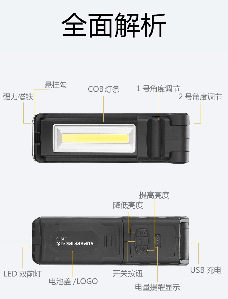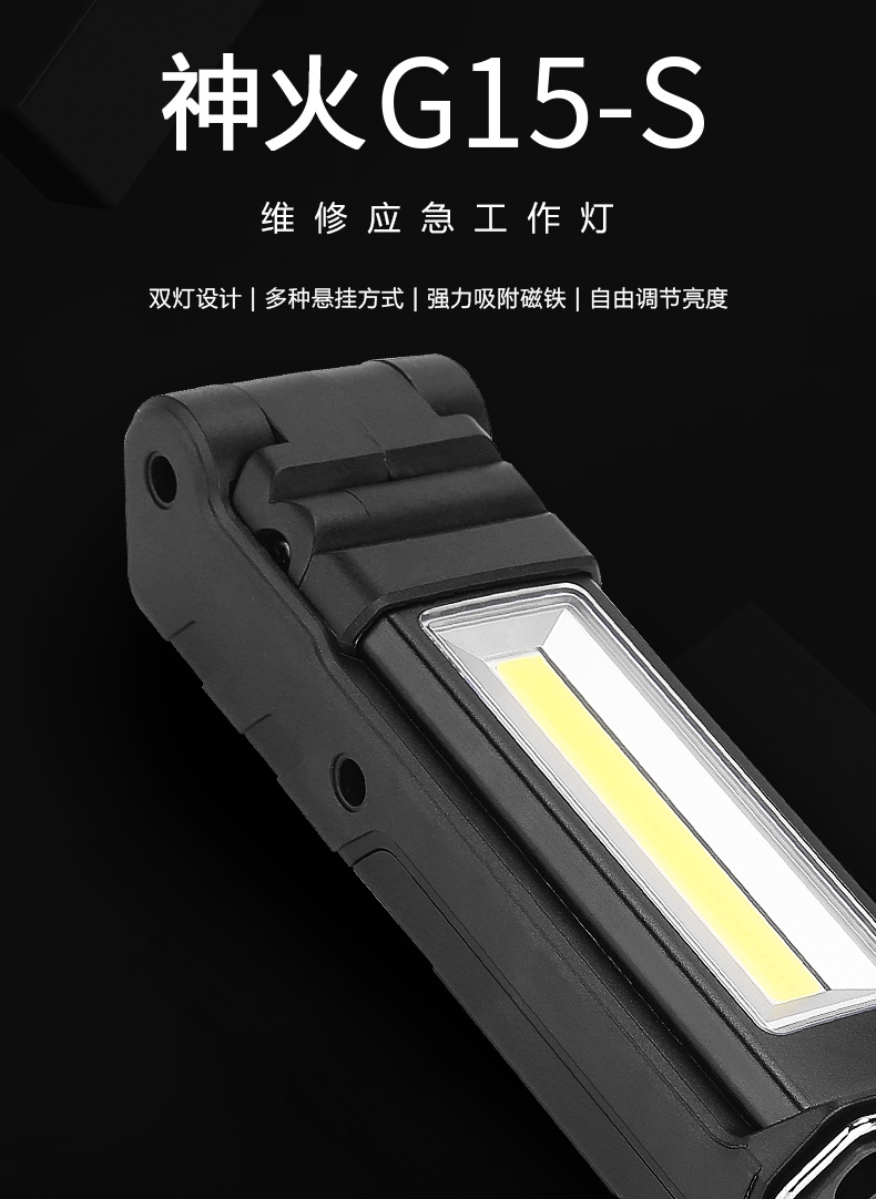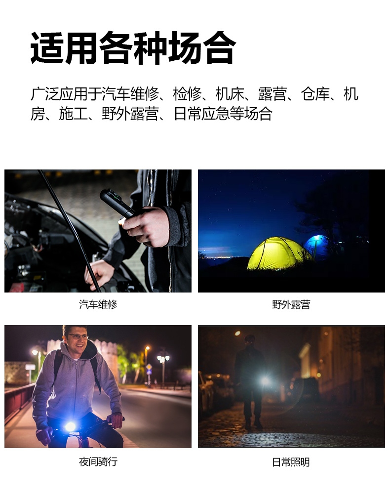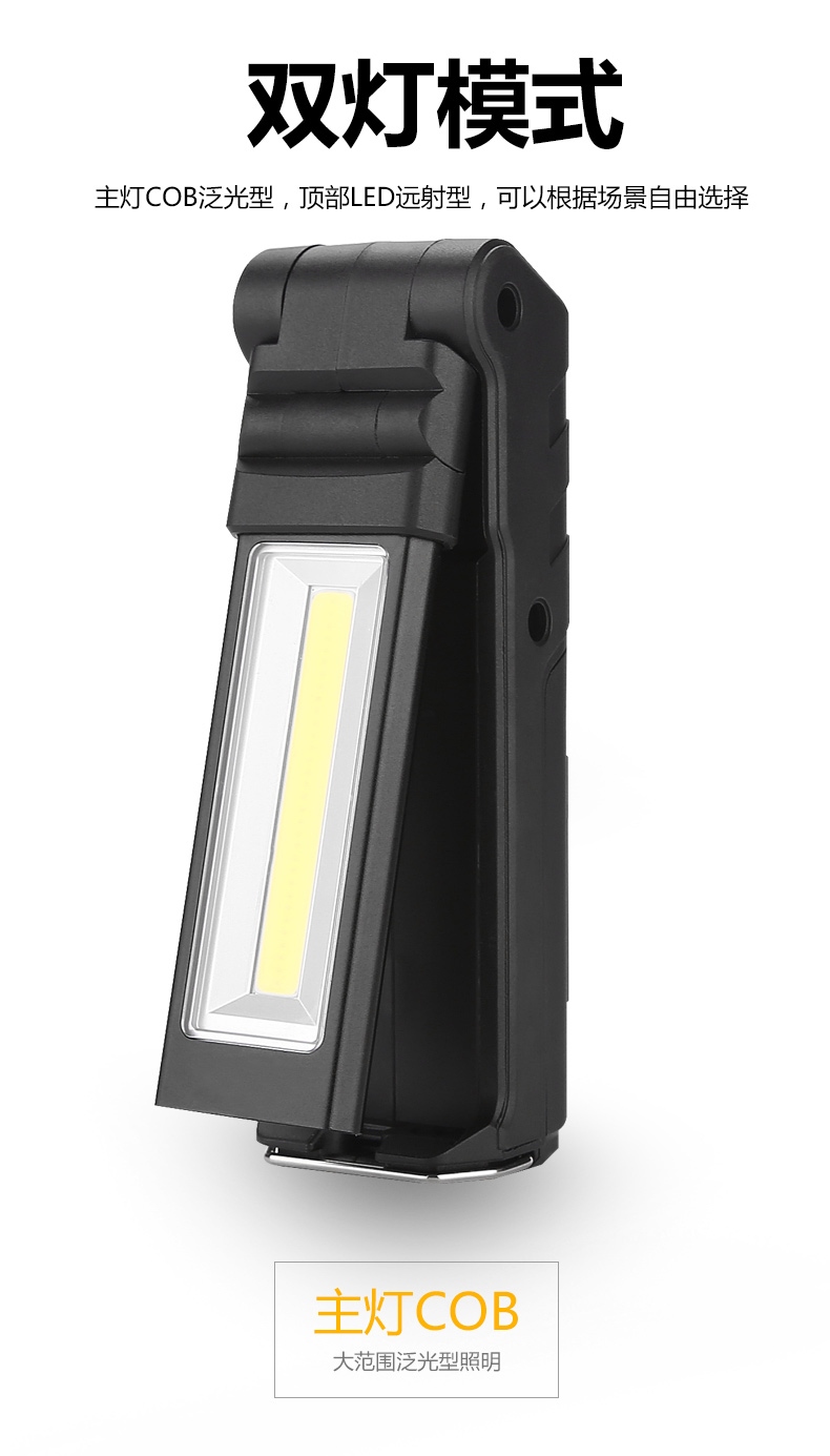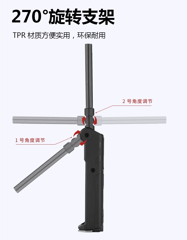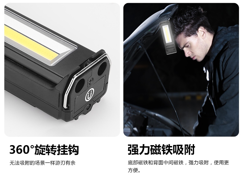 多功能双照明模式工作灯,可270度调节角度、带电量提示、底部双强磁、人性化的设计可随意调节光的强弱(使用TPR材料)