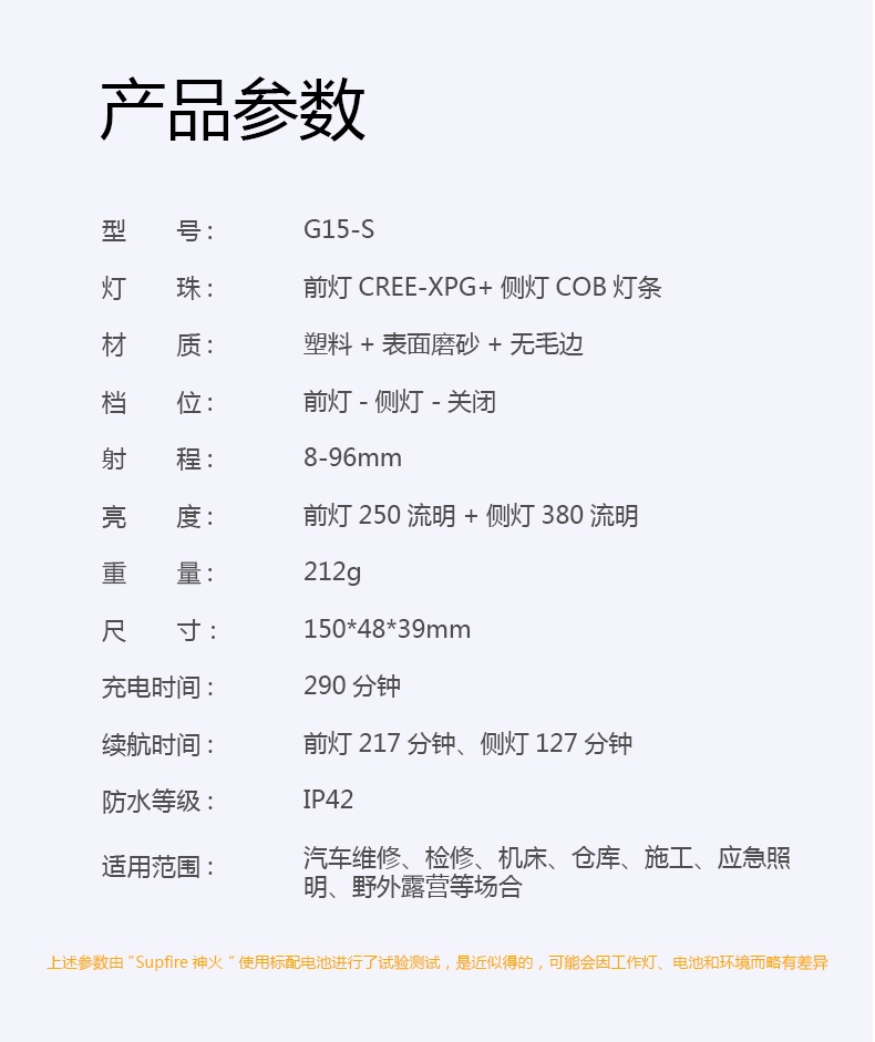 聚光主灯 亮度随心 轻按后端开关按钮,主灯强光点亮,续按依次切换主灯工作光-爆闪光。主灯开启状态下长按5秒,可实现光源色温转换。主灯关闭状态下长按5秒,可开启灯具最亮照明模式。 爆亮强光 亮如白昼 1500LM大功率高亮光源,点亮顷刻如白昼