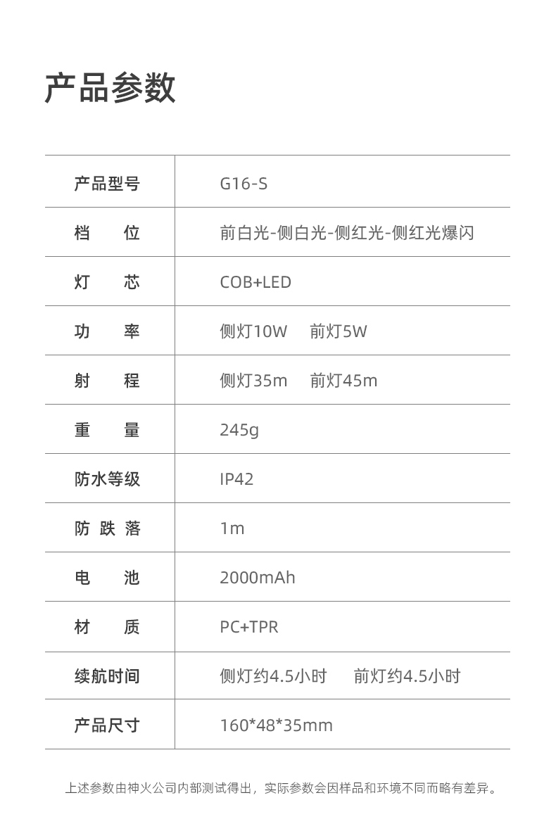 聚光主灯 亮度随心 轻按后端开关按钮,主灯强光点亮,续按依次切换主灯工作光-爆闪光。主灯开启状态下长按5秒,可实现光源色温转换。主灯关闭状态下长按5秒,可开启灯具最亮照明模式。 爆亮强光 亮如白昼 1500LM大功率高亮光源,点亮顷刻如白昼
