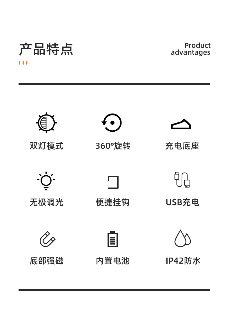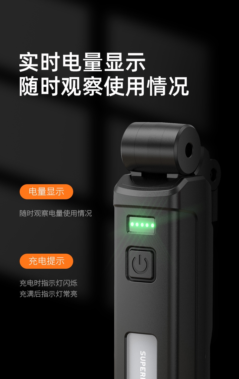 1、此款工作灯有记忆功能,自动记忆上次关闭前的光源及档位; 2、设有电量指示灯,电量情况一目了然; 3、此手电设有磁吸、挂扣及伸缩固定架,多种固定方式满足工作需求.