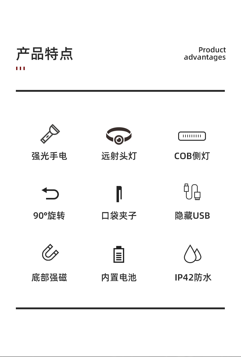 多功能旋转手电(2种光源:白/红光)头部90度旋转、可当头灯、带侧灯、腰夹,底部磁铁可根据不同场景调整照射方向。适用多种场景日常户外、工作检修、家庭应急等