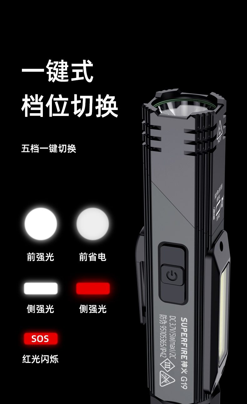 1.单击左边开关开启感应功能,同时开启强光档,续按关闭感应功能(关闭感应功能,光源不会关闭),当感应功能开启时,单击右边开关可正常调节档位。 2.多样化充电,使用方便:设有Type-c充电口,可使用充电器、充电宝、电脑等设备为灯具充电。 3.电量显示:实时