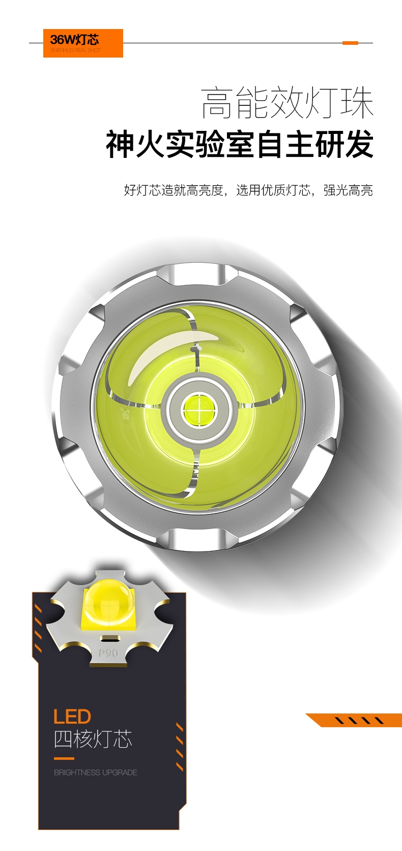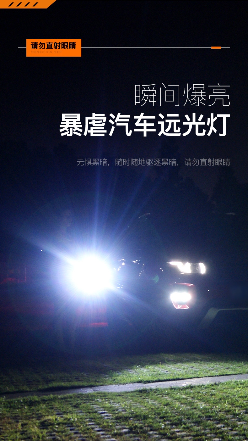 1、大尺寸铝合金光杯,光斑更圆润。 2、新型高亮远射灯珠,40W大功率,亮度高,照明效果好。